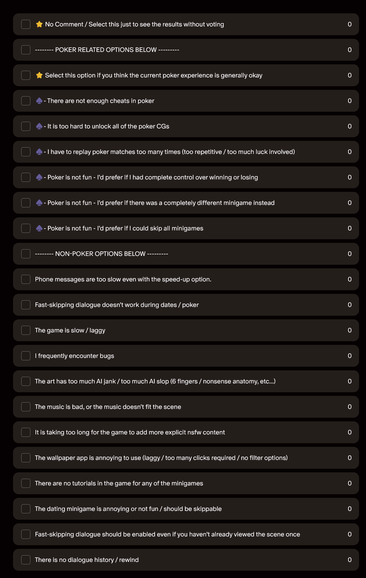 But I know there is inherent bias in polling only patreon members, since they are more likely to enjoy the game how it currently is. So, I want to ensure F95 members can weight in also.