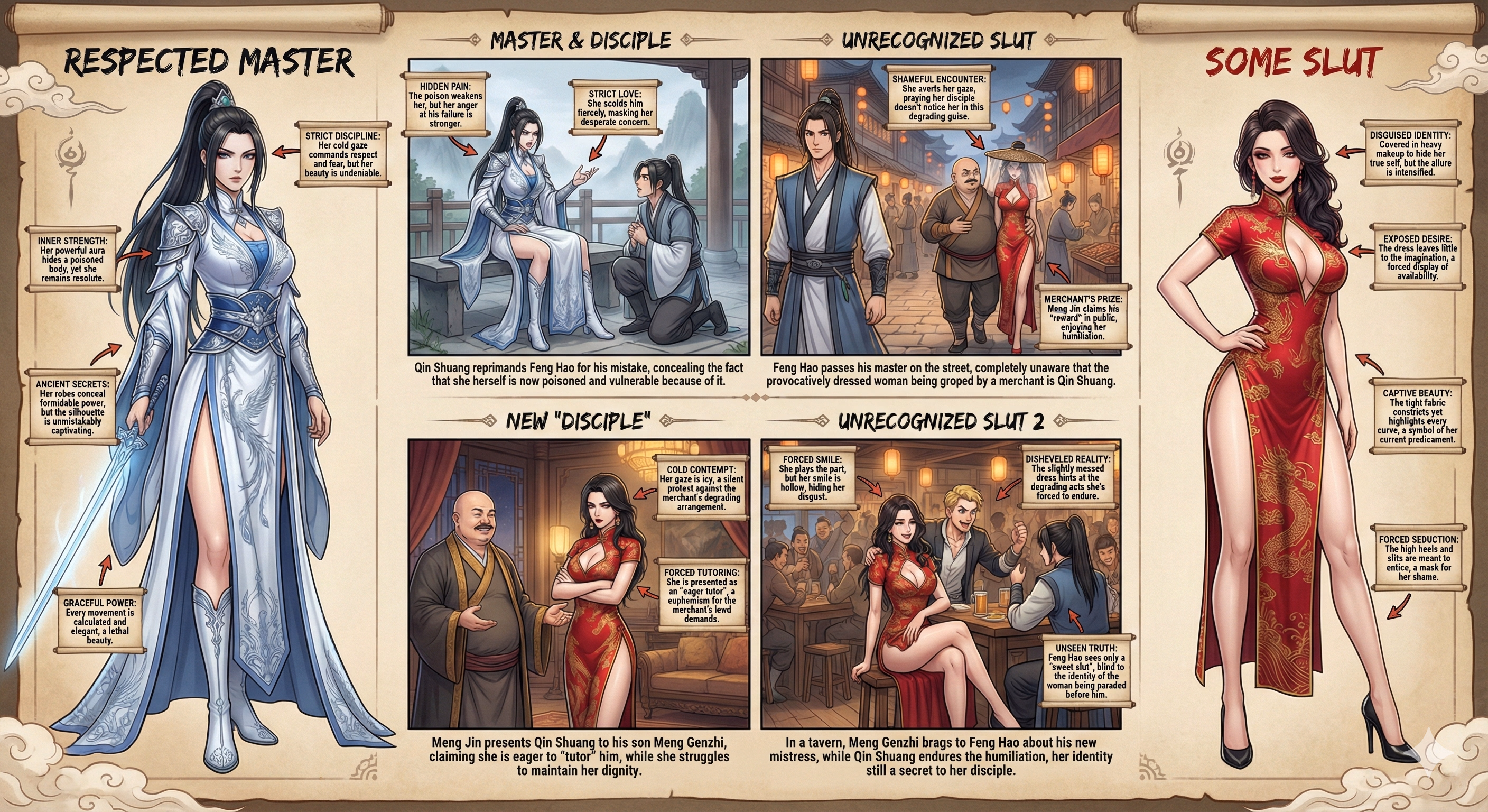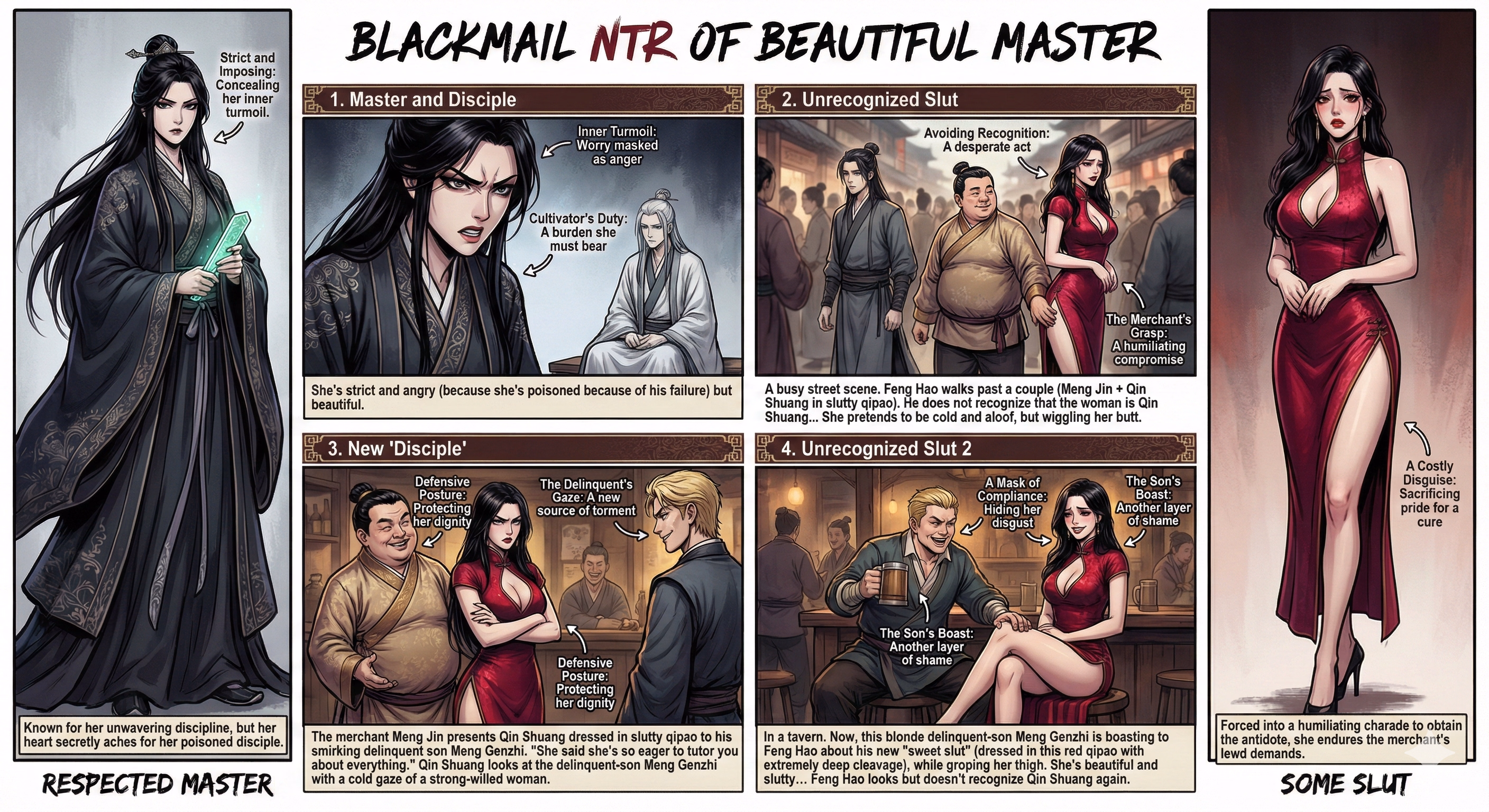 Anyway for specific scenarios. Pure childhood friend forced into a dual cultivation with an old cultivator practicing demonic arts in order to become stronger and help her childhood love.Nano Banana Pro generations, hah. That's why I asked you for ideas.
