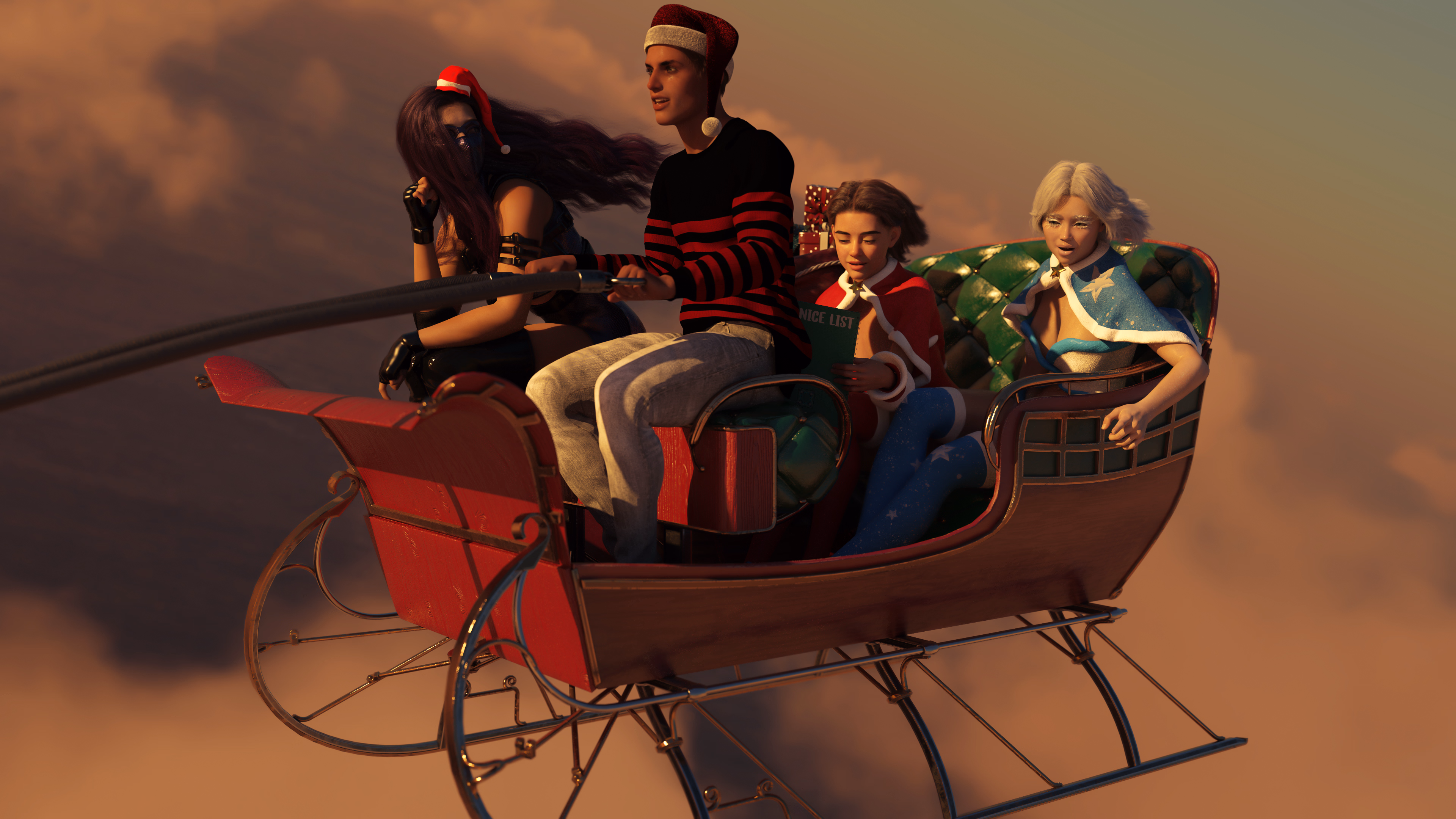 And here comes another wholesome Christmas-themed custom request from Jonathan Hang, in which we learn that Santa needed a break and has recruited MC and the Sisterhood to deliver the presents. I like to amuse myself by thinking about what MC did to poor Santa to gain his ability to fly the sleig