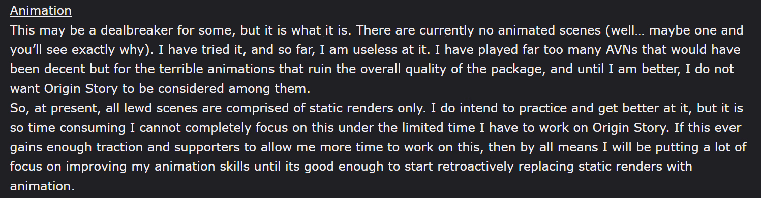 From time to time, he's tried his hand at animations when he had some free time to do so between updates. The verdict so far however is that he's not satisfied with the quality to consider allocating time to them fully for now though, since doing so would not be up to his expected standards and take a lot of time away from developing each update.