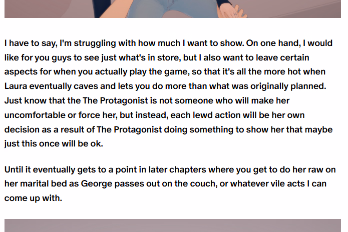 It’s been a couple of days since I last posted, as I’ve been working on Chapter 2. On the side, I also made a patched version of Chapter 1. As I mentioned before, Chapter 1 had a few grammatical and spelling errors, so I went back and fixed those. I also did some minor rewrites in certain scenes, mainly the nighttime scene in Anna’s bedroom and the scene with Laura after the rain.