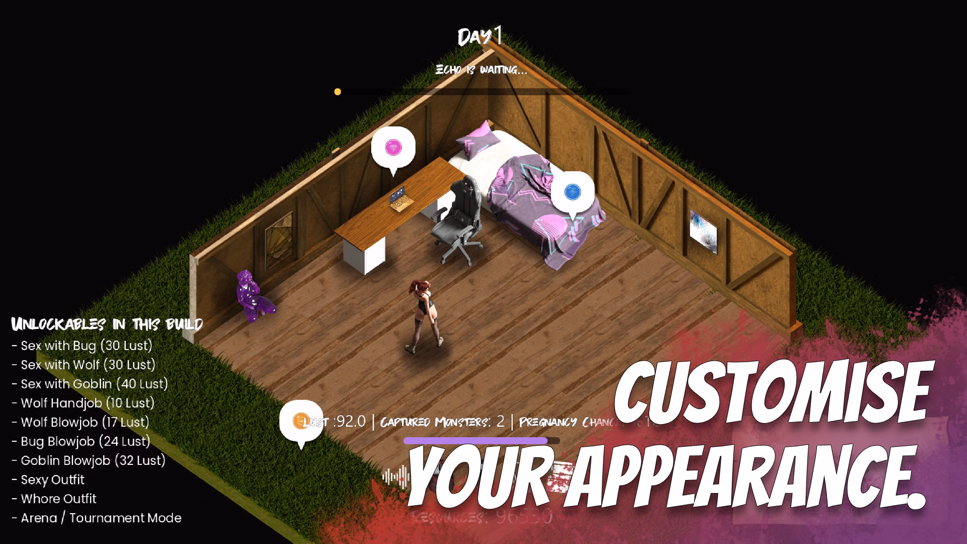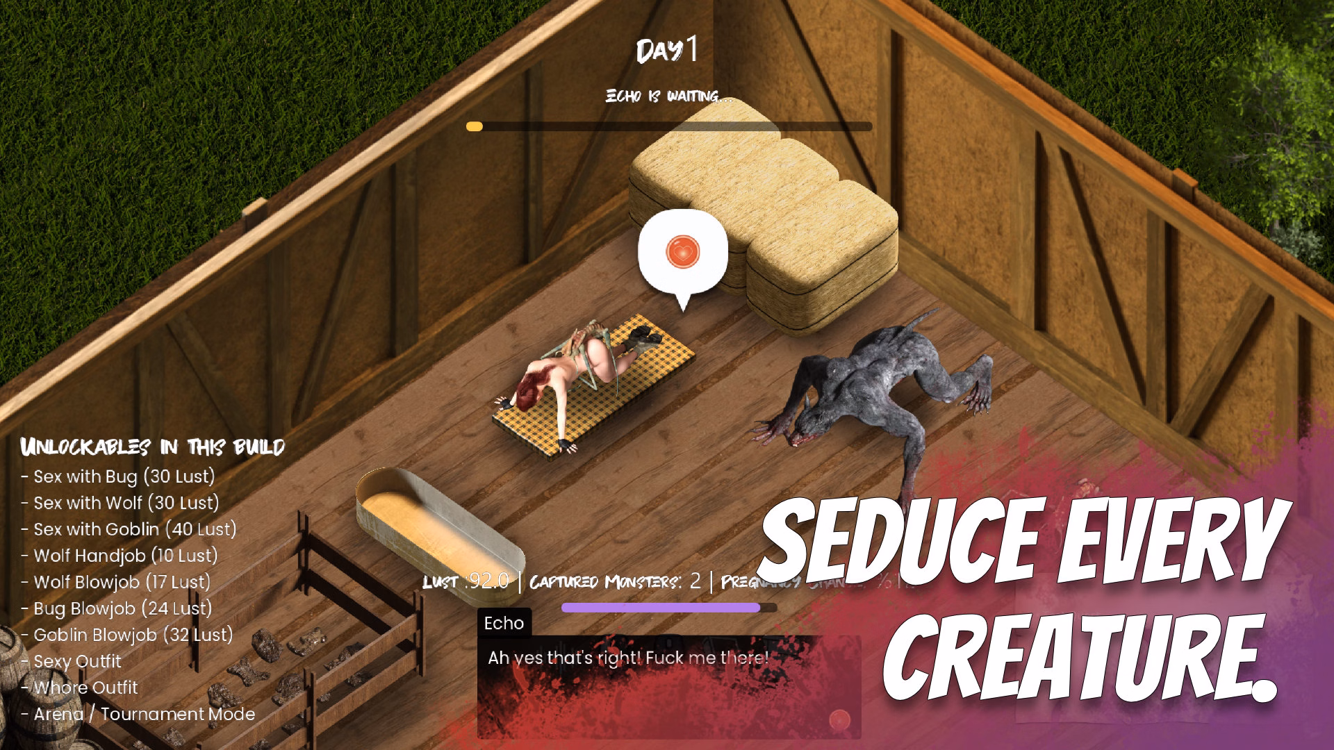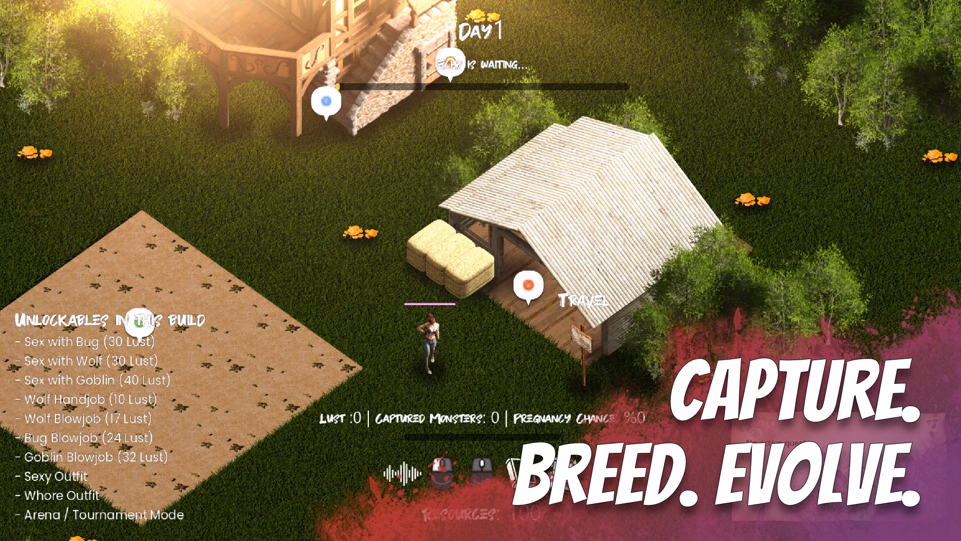 In Pheromone Seasons, you inherit a secluded ranch where desire flows through every season. Gather resources, work the farm, capture and breed monsters, and build bonds that grow stronger over time.