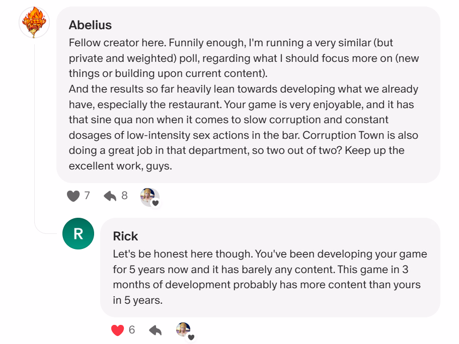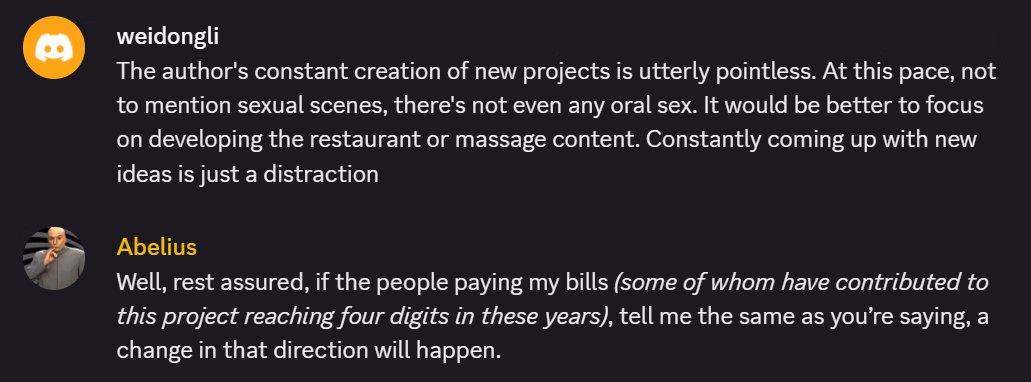 That's a thing? I figured that a dev would feel great about pushing out the content, seeing people's reaction, and then going back to add more stuff because... I mean, I guess the whole process is fun for the dev? But apparently that's not the case all the time. That's interesting actually.Completely spot on. The dev enjoys the programming way more than pushing content out, adding more backend features to "make future content easier to add", yet never adding those future content. Feels like me when I mod Skyrim. I enjoy the install process, the troubleshooting if things go wrong, but once everything is installed and working properly, I get bored playing it after a couple of hours..