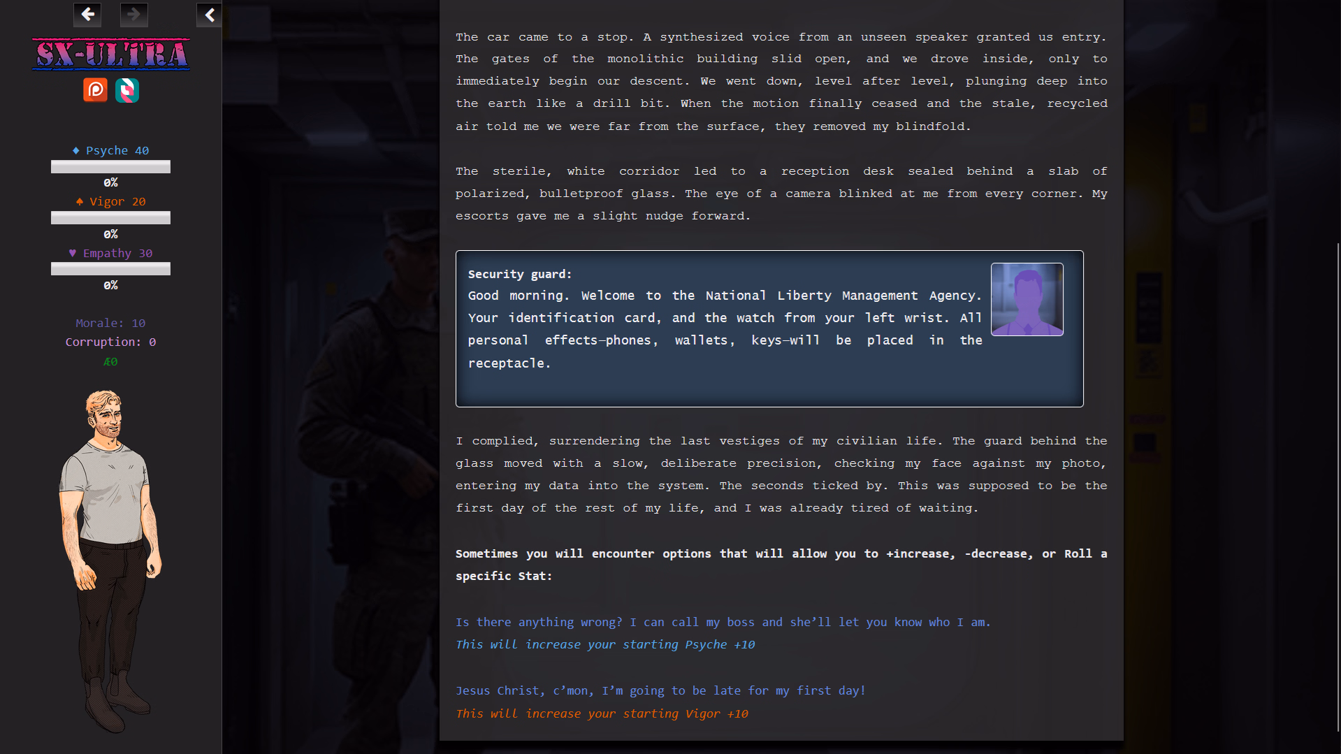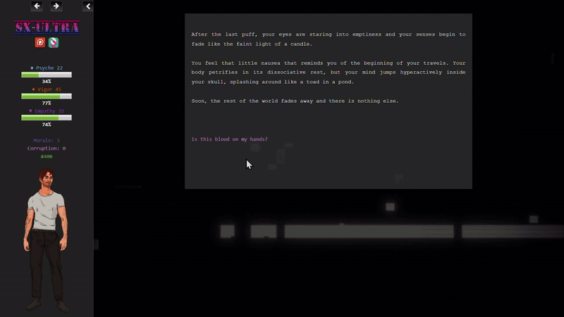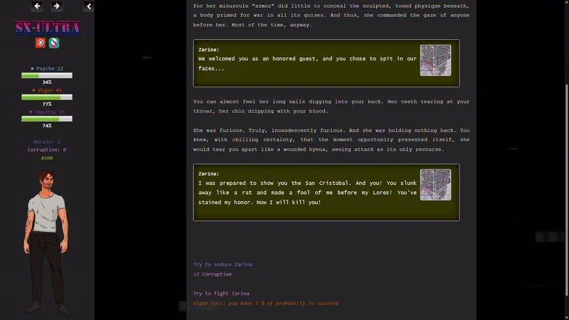 You're right about Ree not appearing on the relationship section. She will appear eventually once there's more available content with her, but since your relationship with her doesn't grant any new scenes nor affects the gameplay in any way for now, we decided to include her later when it actually "makes sense".Very interesting story so far!I finished File #5, so I appear to be at the end of the current content. I was sadly not able to unlock the 4th session with Morgan. Act 1 of Morgan and Rhea's quest is complete. I've changed my avatar to being Tridian but it didn't trigger any new content. I've switched avatars back-and-forth but that doesn't seem to trigger anything either. I've tried building up a strong relationship with Rhea/Ree by doing lots of rerolling to always encounter her at the BodyFlex Pavilion. We should be at least friends by now but she isn't appearing under the relationships list. Morgan doesn't seem to want to speak to me anymore and I'm not able to find any random encounters anywhere outside of Smart-Flesh. Maybe I've spent too much time playing around in Palais Eros. My corruption level is 129 right now.
