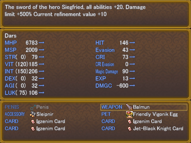 Balmun: All Stats +20 (Including Hit and Eva, so they actually double dip because you get Dex and Agi too), 500% Damage Cap, 1/15 from Sigurdrieva.