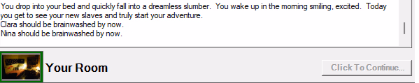 I've got another bug if you're willing to look at it. Going through Lilith Device again and I've hit a roadblock. You're supposed to go to sleep after brainwashing Clara and Nina, in the RAGS version you get a message like this.It was a bug in Regalia that I've just fixed in my repositoryYou must be registered to see the links.