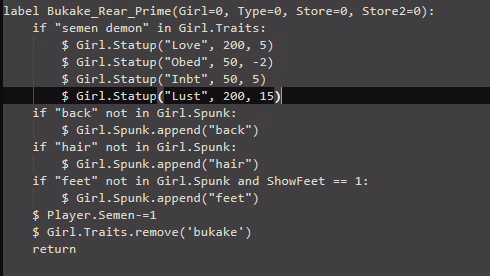 I don't know if that's an issue caused by the code. Since I'm pretty sure I didn't touch the Girl_Cleanup. I'm testing it right now on the Renpy 8.3.7 version (idk if that effects anything) and I'm not running into the issue yet with neither Male or Female.Code:I'm sorry, but an uncaught exception occurred. While running game code: File "game/script Orgasms.rpy", line 1644, in script call File "game/script Orgasms.rpy", line 1644, in script call ScriptError: could not find label 'Girl_Cleanup'. -- Full Traceback ------------------------------------------------------------ Full traceback: File "script Locations.rpyc", line 580, in script call File "script Functions.rpyc", line 909, in script call File "script Scenes.rpyc", line 10521, in script call File "script Locations.rpyc", line 166, in script call File "script Functions.rpyc", line 1357, in script call File "script Addiction.rpyc", line 9, in script call File "script Addiction.rpyc", line 2473, in script call File "script Addiction.rpyc", line 1141, in script call File "script Sex.rpyc", line 1375, in script call File "game/script Orgasms.rpy", line 1644, in script call File "renpy/ast.py", line 1427, in execute File "script Locations.rpyc", line 580, in script call File "script Functions.rpyc", line 909, in script call File "script Scenes.rpyc", line 10521, in script call File "script Locations.rpyc", line 166, in script call File "script Functions.rpyc", line 1357, in script call File "script Addiction.rpyc", line 9, in script call File "script Addiction.rpyc", line 2473, in script call File "script Addiction.rpyc", line 1141, in script call File "script Sex.rpyc", line 1375, in script call File "game/script Orgasms.rpy", line 1644, in script call File "renpy/script.py", line 1103, in lookup ScriptError: could not find label 'Girl_Cleanup'.