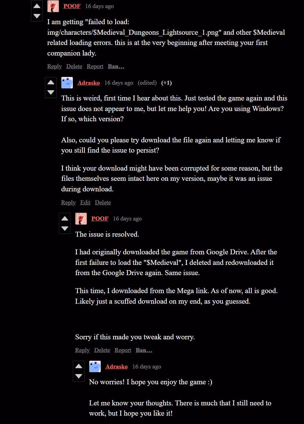 Well, that was not a mistake with my game, and I want to be clear about that. My game is playable on itch.io for lots of people and they are all playing it, only situation where this happened was from a guy who had a corrupted download when getting the game on mega.I gotta love games that don't even include all the files need to play it. I try to go through the only door that actually works within the first thirty seconds after the intro and immediately get a error message telling me it can't load something. I can't do anything because of it. Not even wasting my time on this one.
