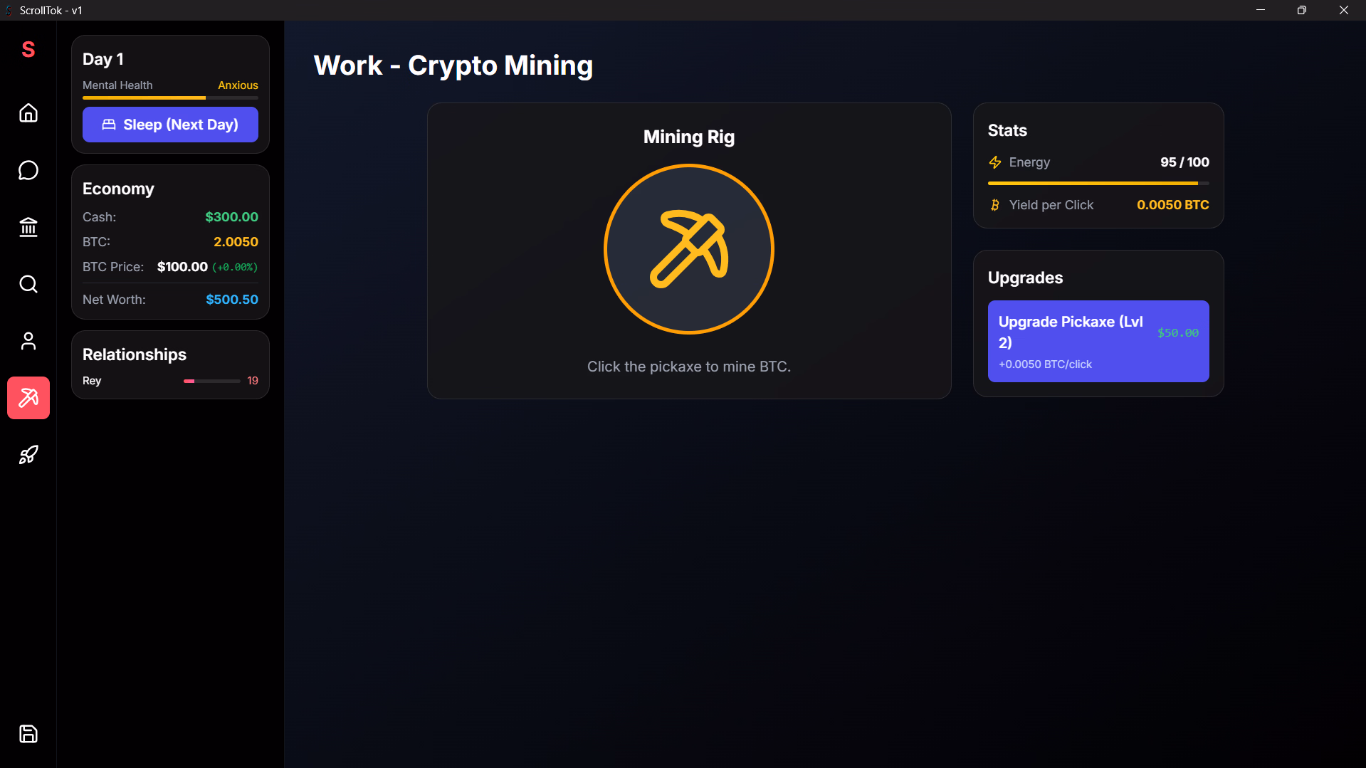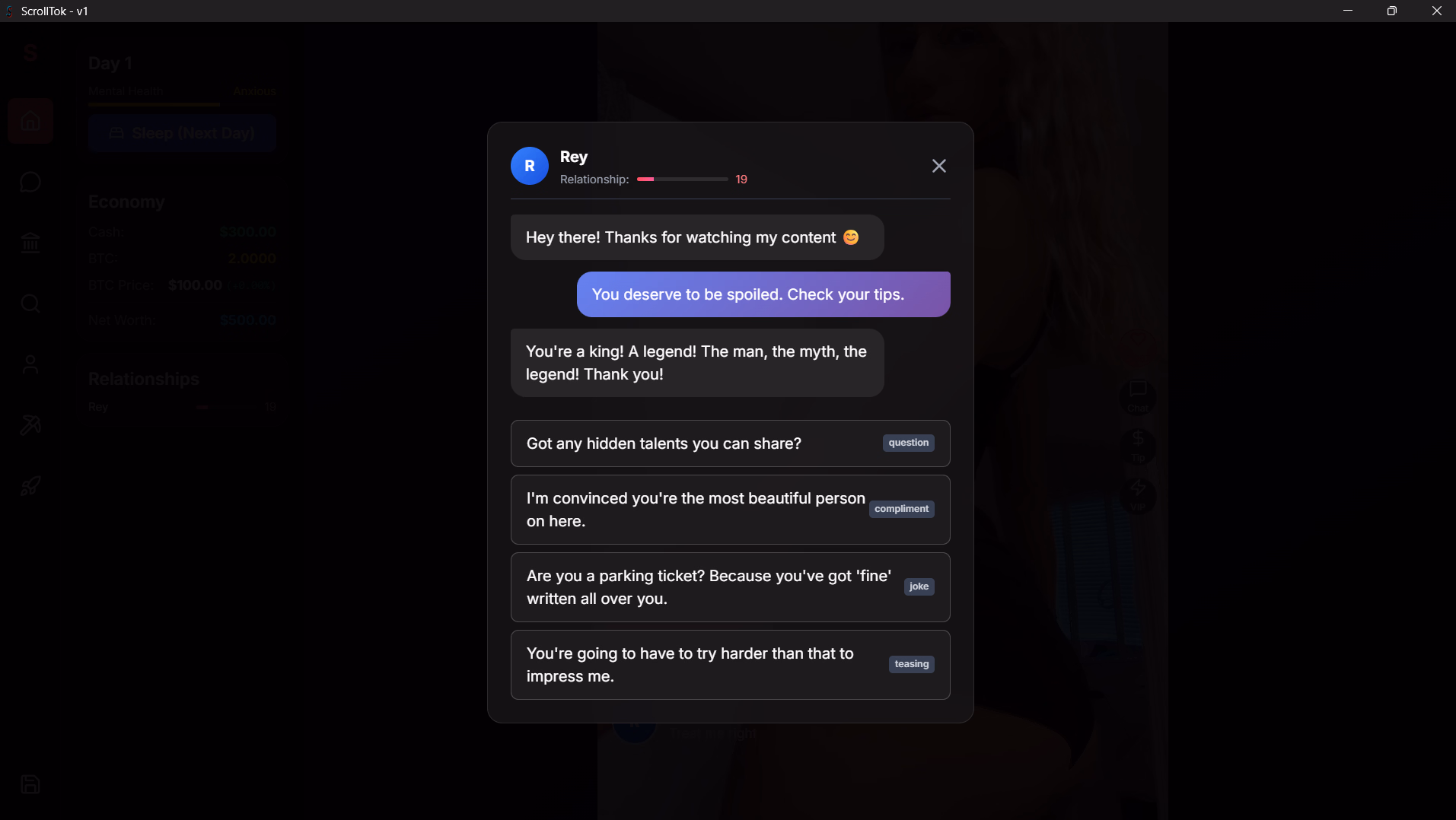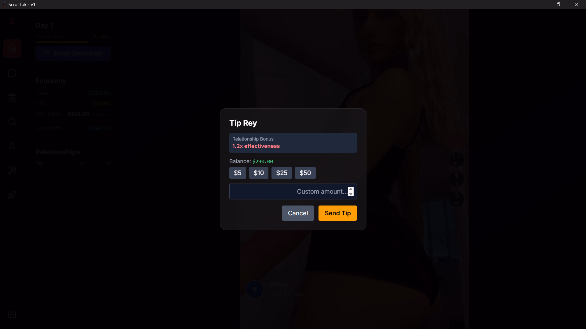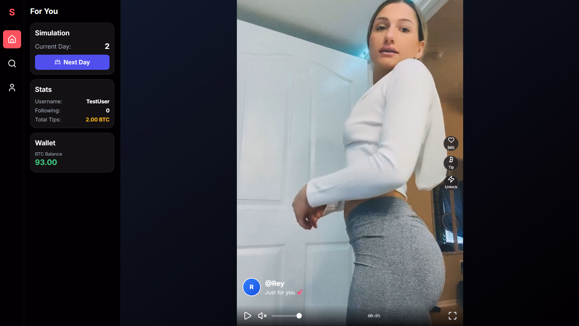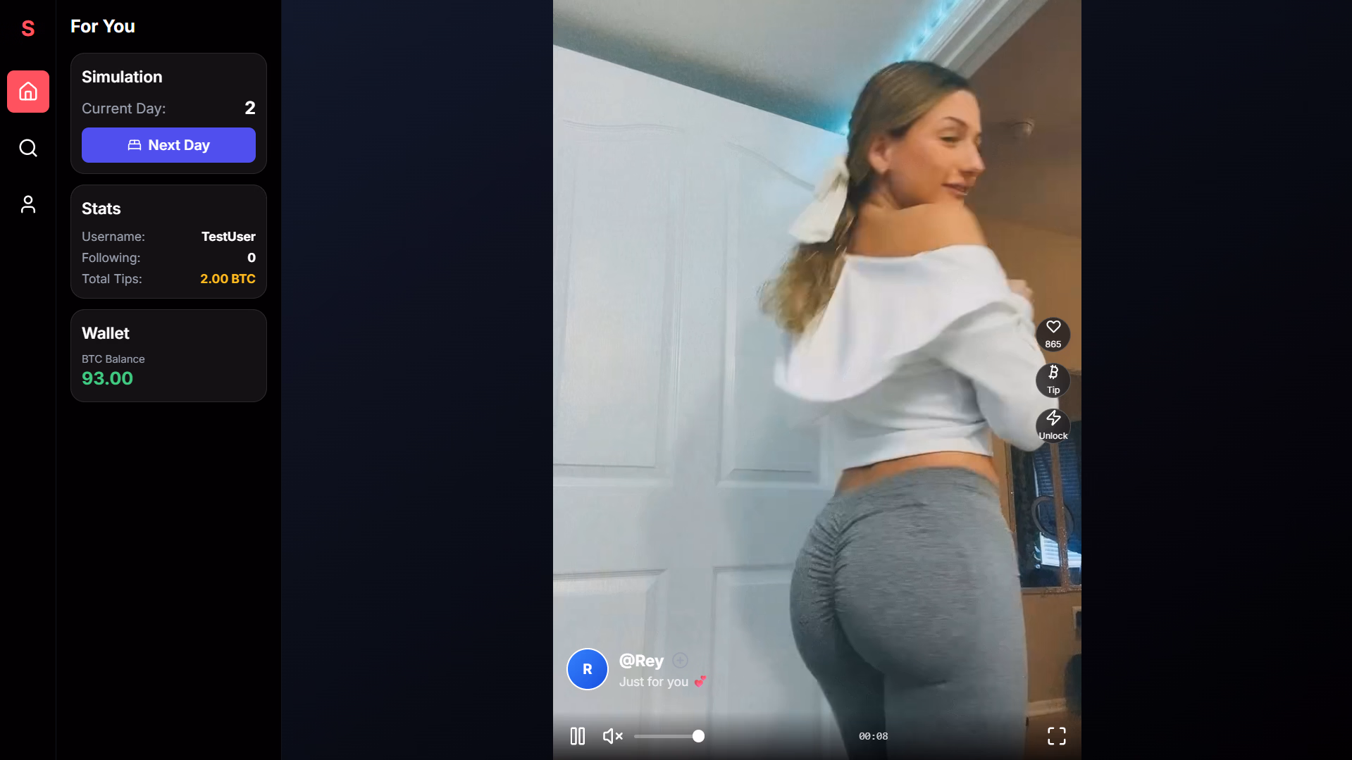 ScrollTok: Where every scroll has a price. Welcome to ScrollTok, the most exclusive and addictive video feed on the web. Dive into an endless stream of captivating content from four unique creators, with new videos dropping into your 'For You' page every single day. But this is more than just an app! It's a life simulation. You start with a daily stipend of BTC, but you'll have to manage it carefully. Pay for your daily rent, food, and even your ScrollTok subscription fee. Every choice matters. Will you spend your balance tipping your favorite creators and quick-unlocking their next video, or will you save your funds to ensure you don't go bankrupt? Your goal is to survive for 30 days to unlock every video and see what happens.