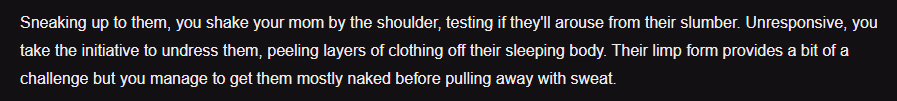I gave your game a try. I have to admit, even the newest drugged scene was not compelling at all to me. Your use of they/them pronouns when talking about the mother is... weird. I understand you were likely writing it in this way so that you could insert the same text into both the male-MC and female-MC versions of the game, but... that's not great. It's a minor thing, but it takes you out of the moment when you read this kind of stuff: