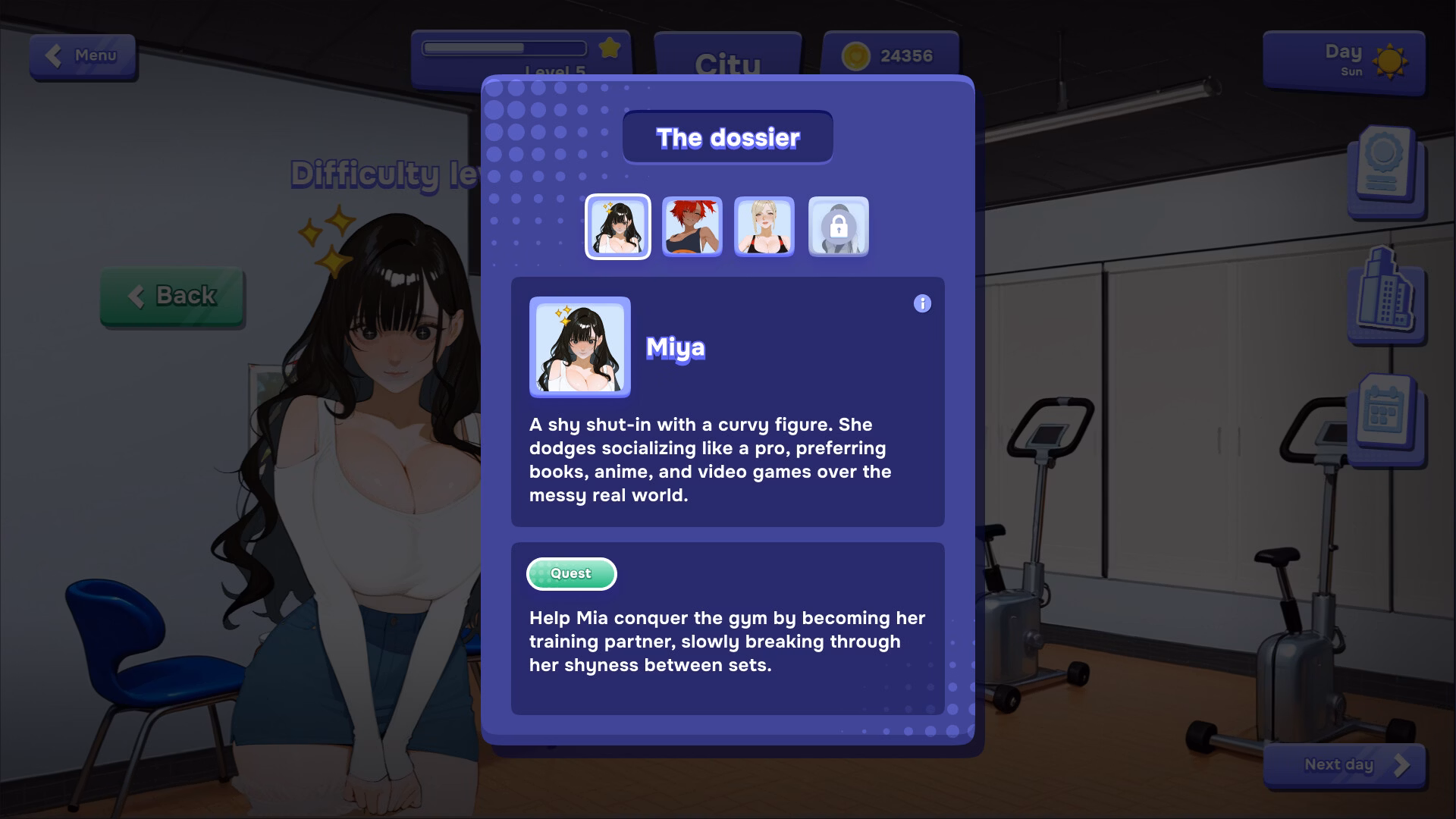 Train gorgeous girls in your own gym. Manage workouts, boost stats, schedule personal sessions, and guide each heroine through her desires and dilemmas. Turn sweat and discipline into confidence, curves, and pure sexercise!