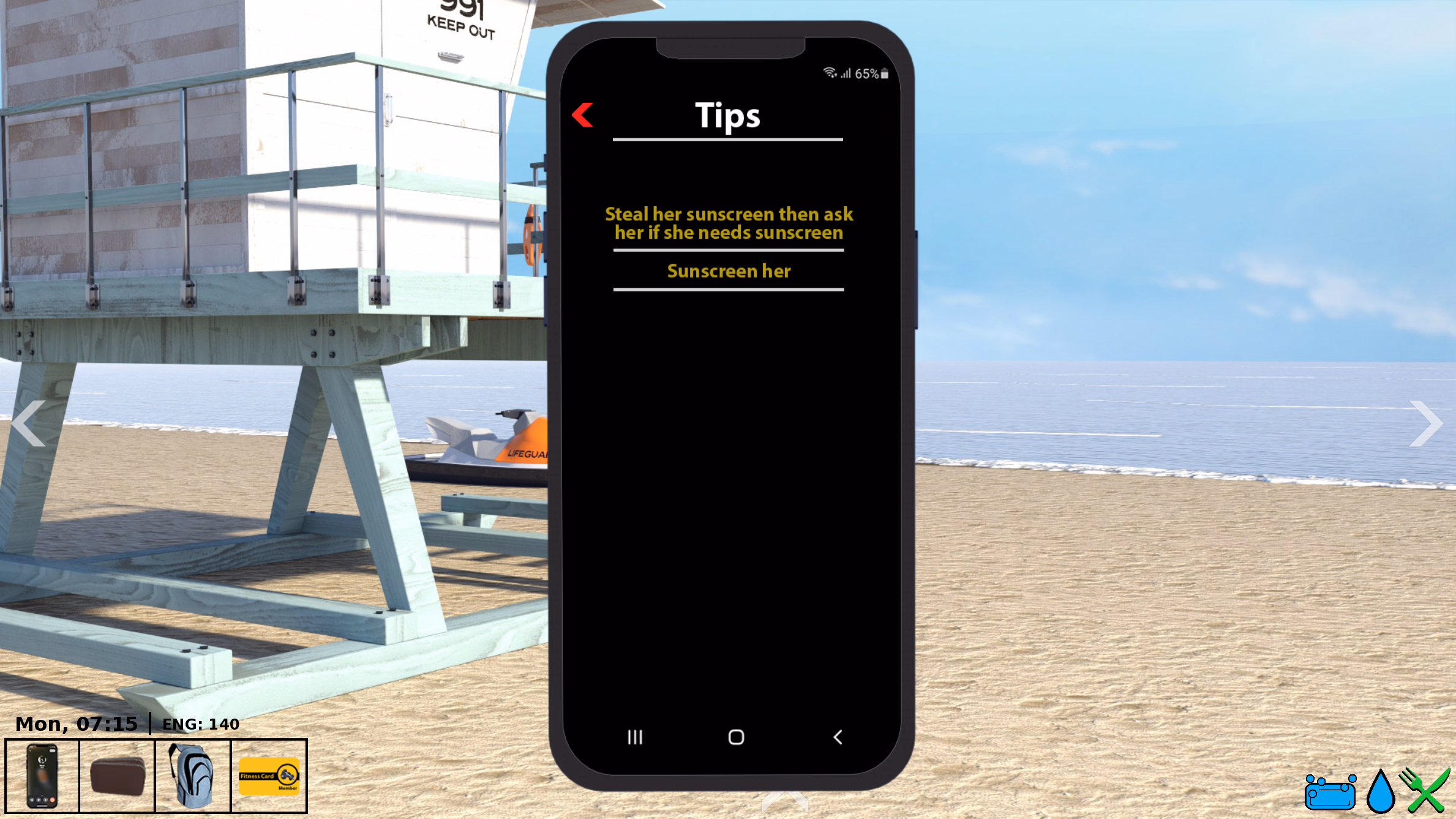 but has anyone figured out what to do next after stealing the sunscreen from Nicole, the only new thing I can do is struggle during the swimming lessons, there's no opportunity to ask if she needs sunscreen