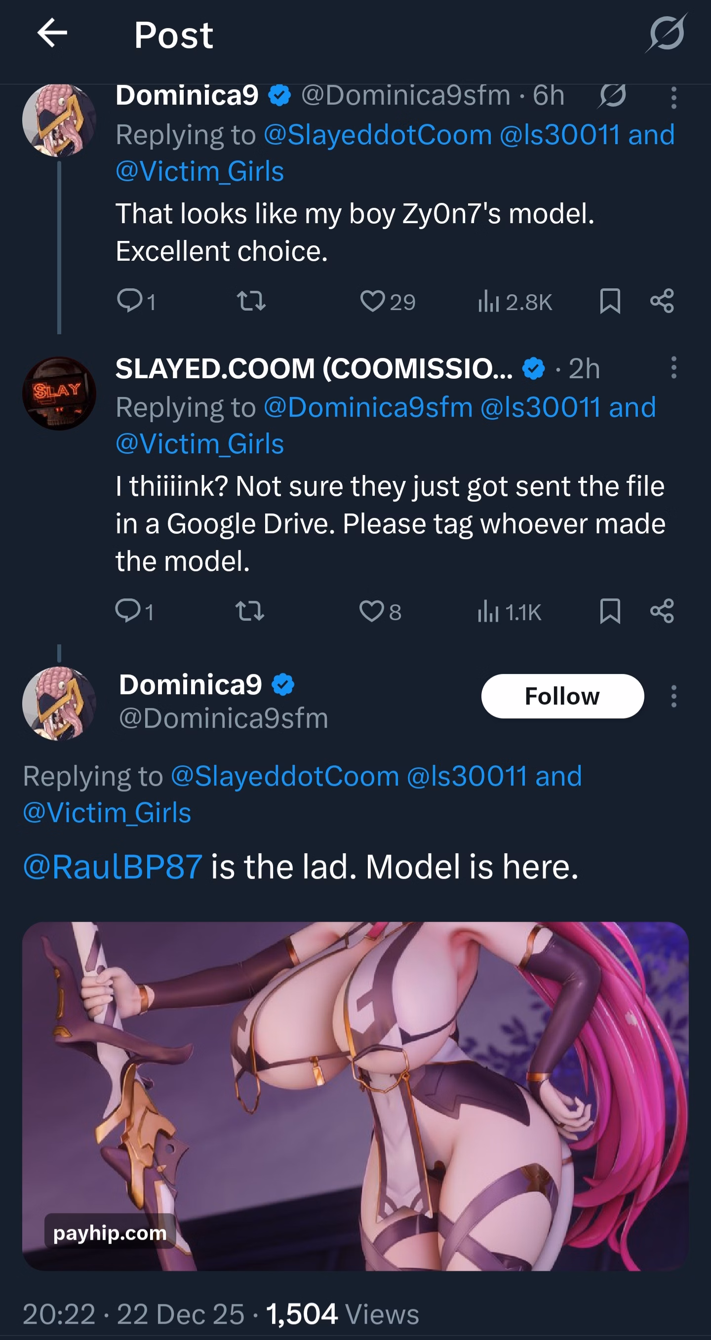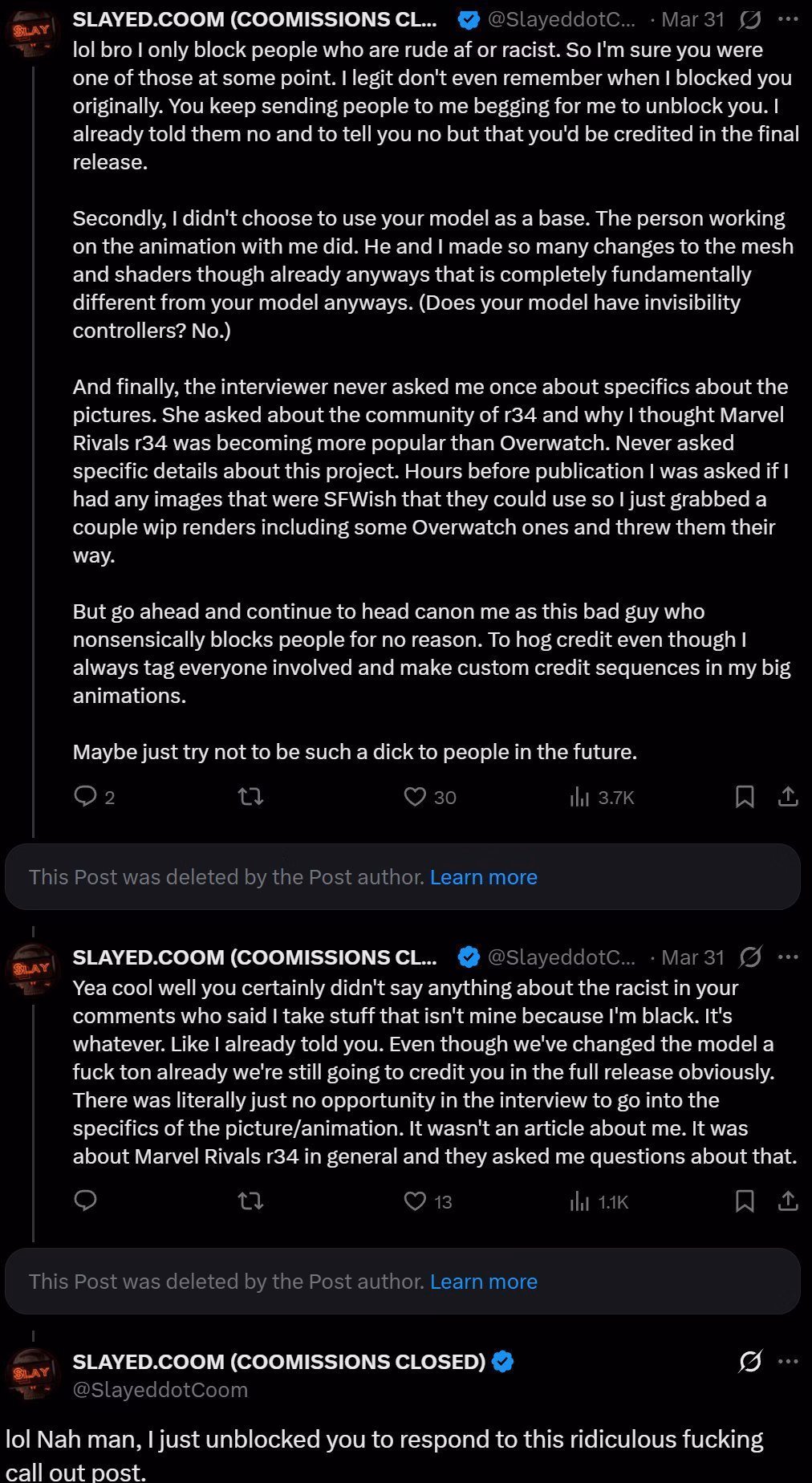 is this related my situation ? because at first when i saw this i though they were trying to somehow gasslight people into thinking that actually he didn't even use my model and it was someone elses. thb it's 100% my model coz he didn't even change the bodyshape, the texutres, the suit tear is the same as i painted myself. also it's funny to me that he says "we heavly modified the models, when it looks exactly the same as when i posted it on smutbase, i saw people credit me on really modified models, Cerbsky for example, i wouldn't even think it was my model if he didn't credit me. Slayed is just making moronic excuses just to save his pride