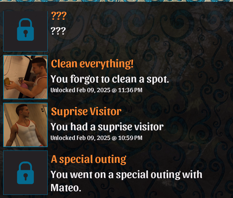 yeah, I got the scene. Looks like I just have to fuck with Mateo and no one elseI think you have to fuck with Mateo (the moment that the game give you the two options, fucking Mateo or the other one). Then later you'll have the special outing.