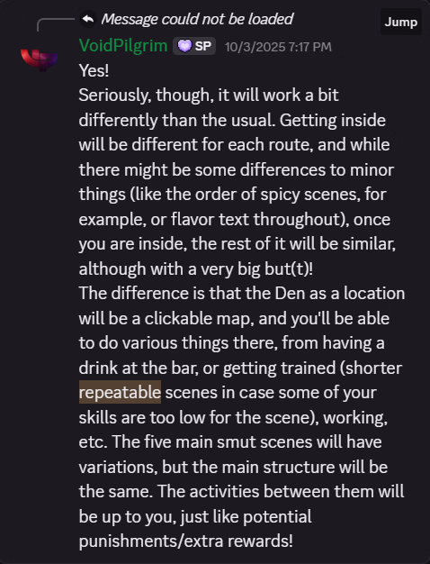 Repeatable scenes would be great if you're playing particularly slutty but I could see them as low priority compared to scenes that are for the purpose of introducing new places, characters, jobs, or deepening bonds with the main cast.