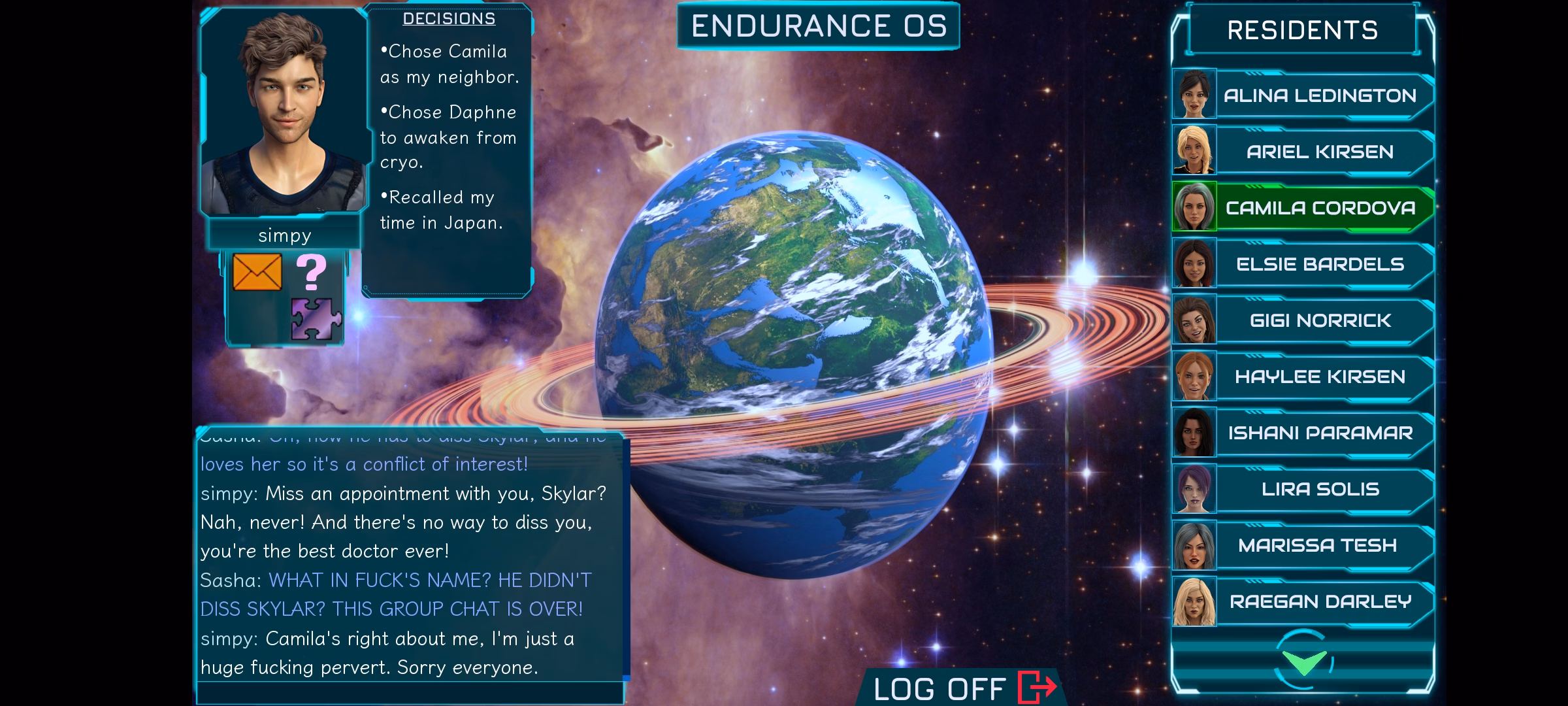 - You can click on a brighter green resident over on the right (in this case, Camila) to have a conversation with them.