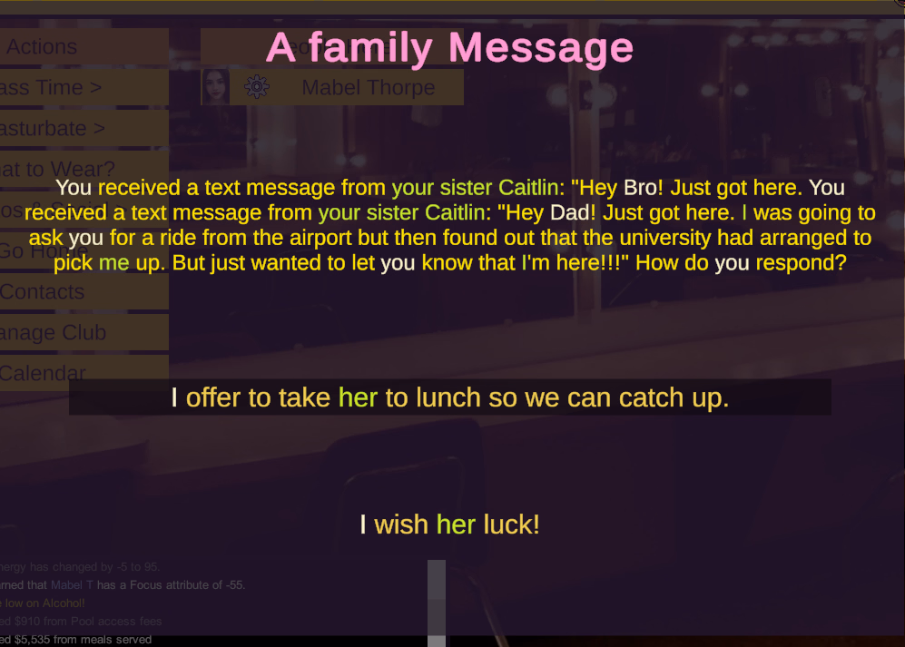 Sex should have a more direct reward since that is the most played mini game i suspect. Like start off at -5 affection then you have to perform to get out of the hole. Would keep you from accepting everything when you have zero energy so you don't lose favor, you couldn't do that anymore. Then you get 3 points for getting her off and 2 points for getting off just to break even. Then you get points for cream pie vs condom and then it would be nice to flip over to her energy without getting it in the ass somehow so you can get in a couple extra I think my record is 5 and 3 but after a performance like that there should be direct reward like there is in the gambling games. You should be pretty high on her list if you can get her off 3 times much less get her to do the work so you can get 2 in a night. You can do that by banging one in the evening to less then 20 energy then sleeping at night, banging another one with 100 new energy from sleeping get below 50 then sleep in the morning til noon. But if you can get their energy involved like they seem to be more inclined to do when you win a bet with them. You might as well put in the options the option to give yourself 99 million is you want to focus more on f ing around. Just another sandbox style.