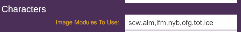 image_modules string scw,ice,ccw,exp,lfm,dstu,gar,nyb,alm,scx,tot,num,crc,ofg # comma separated list of image modules to useAs mentioned above this post, you don't need to alter any mod file or anything. Once you launch the game you go into "Options", scroll down to "Characters" and simply add the 3 letter module keys for all image packs you're using. For instance mine looks like this: