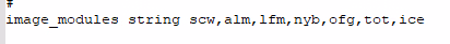 I feel like I haven't even seen some of these ones before haha. There needs to be a compendium somewhere XDimage_modules string scw,ice,ccw,exp,lfm,dstu,gar,nyb,alm,scx,tot,num,crc,ofg # comma separated list of image modules to use