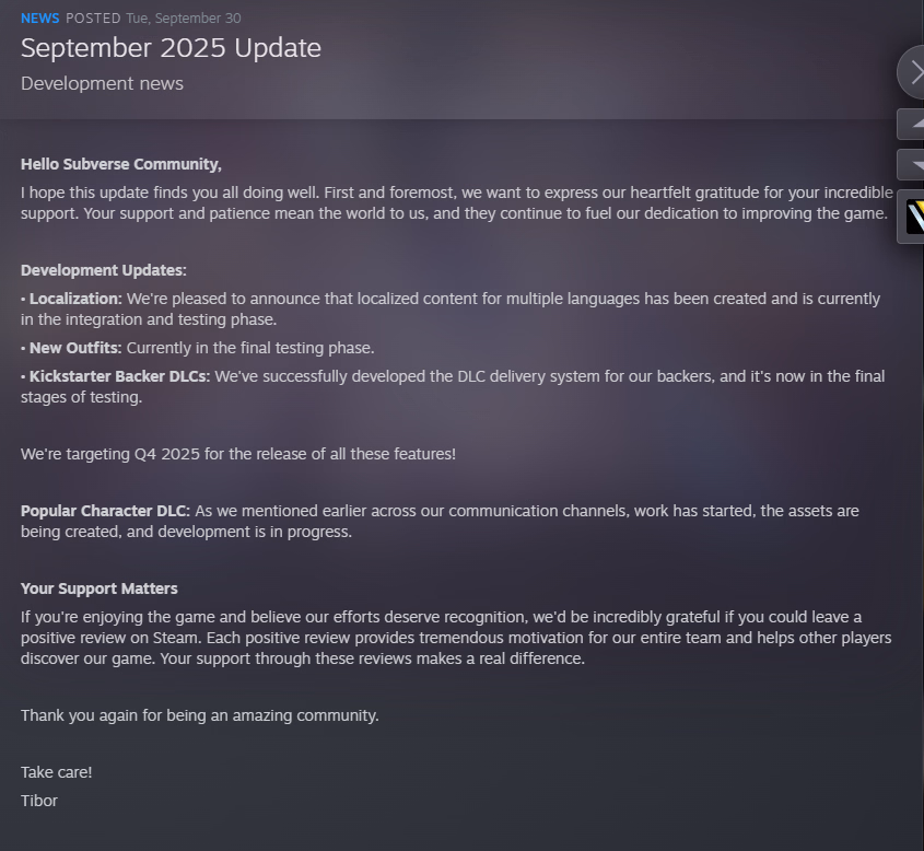 Hello Subverse Community,"I really enjoy the game, but the reality is that it feels dead. There are no updates, barely any discussions about it on forums, and even on X almost no one talks about it. Honestly, I don’t have much hope that this game will last much longer."