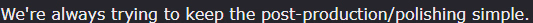 That's not where the work ends unfortunately. We're always trying to keep the post-production/polishing simple. It's not always super efficient, but the outcome tends to be acceptable. Our approach to this was... quite different before 0.5. And in many ways, the long form we've been trying these past few updates has hindered us a lot. In all honesty, short form might be a better fit for us. And we've got a fix coming up for this, which is that the updates are no longer going to have a set end point that we're working towards. Instead the updates will have simple render-based goals, and you can chain several updates together if you want to wait for more content.