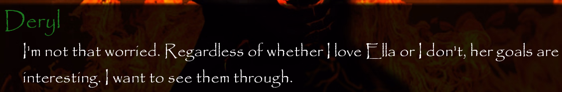 Though, it could also be her plan. I still think it's weird that Deryl never actually told MC and his friends Ella's plan. Since he knew it before becoming a monster and after becoming one. I'll ask WW next stream because I do think it's weird for Deryl to withhold that information. It's the same about the Apostles too. He clearly knows about them to have a discussion with Tanos. But he never talks with MC about it? Even though MC told him earlier Aos telling him to say hi to the 4th or 3rd for him.