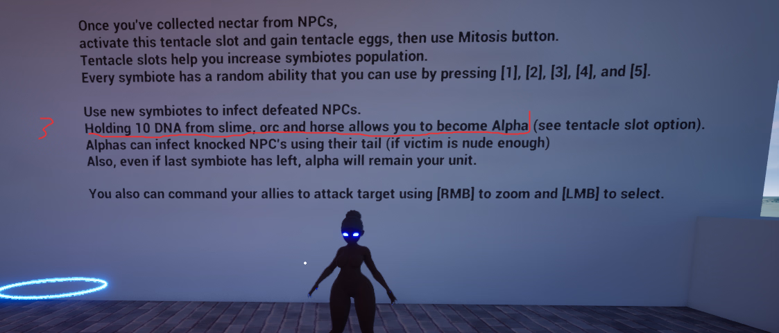 The Demo (tutorial) map needs some better explanation on how "Mitosis" works. I've tried with nothing in the stomach but the symbiote and 3 eggs, with various amounts of DNA (0-20 of each DNA (like you need to evolve a character to Alpha). I've tried with various amounts of nectar and eggs in the stomach. The "Mitosis" button still remains greyed out in both the tentacle spot and the tab menus. I'm not complaining, I just think it would clear up confusion and repetitive questions if the the exact specifications for the "Mitosis" to be enabled was quantified and specified in the tutorial texts.