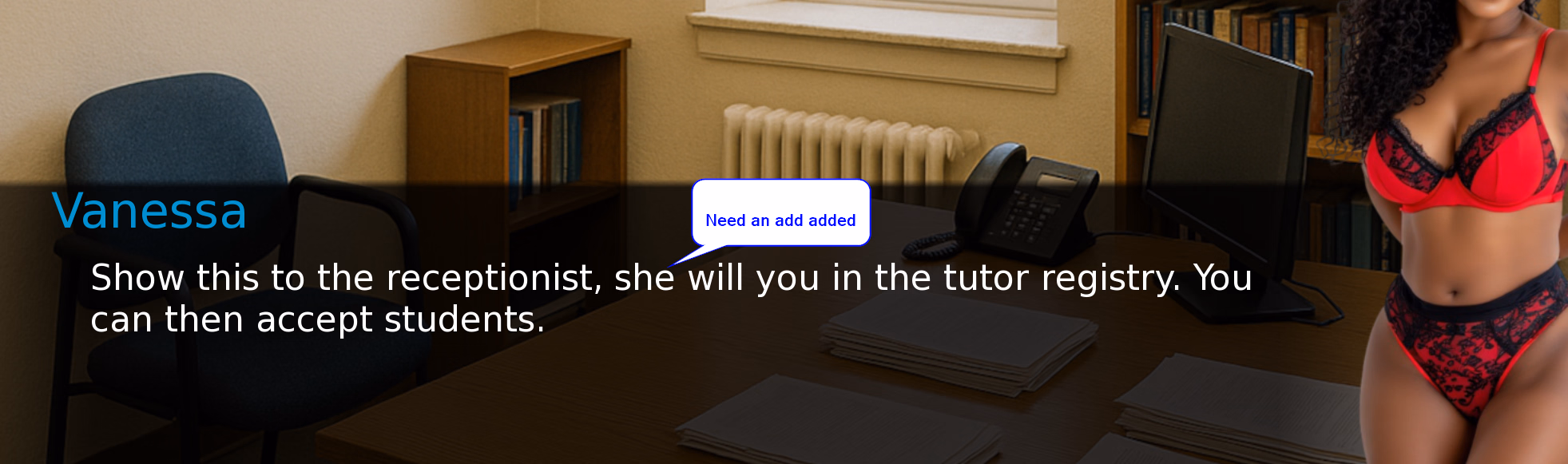 I thought about this for a bit, and I feel like the Dr. isn't solidified as a negative force enough. I think to fix this we need to know more about the MC's life before he gets kidnapped. It's presented as kind of shit, yet the doctor scoops us off our feet, gives us a hunky superpowered body and are giving the task of fucking a bunch of babes. It feels like she's helping the player more than hurting. Maybe she kidnaps the player's family and holds them at gunpoint, or will do torturous study to them to get more of that DNA.I tried to make it pretty clear that Dr. Grove is not trusthworthy with the disclaimer at the start. There is a scene at the end of this version that puts what she tells the MC at the start into context and I think lightens the narrative. I was really hoping people wouldn't take what she says at face value because she literally kidnaps the MC and is keeping him hostage.