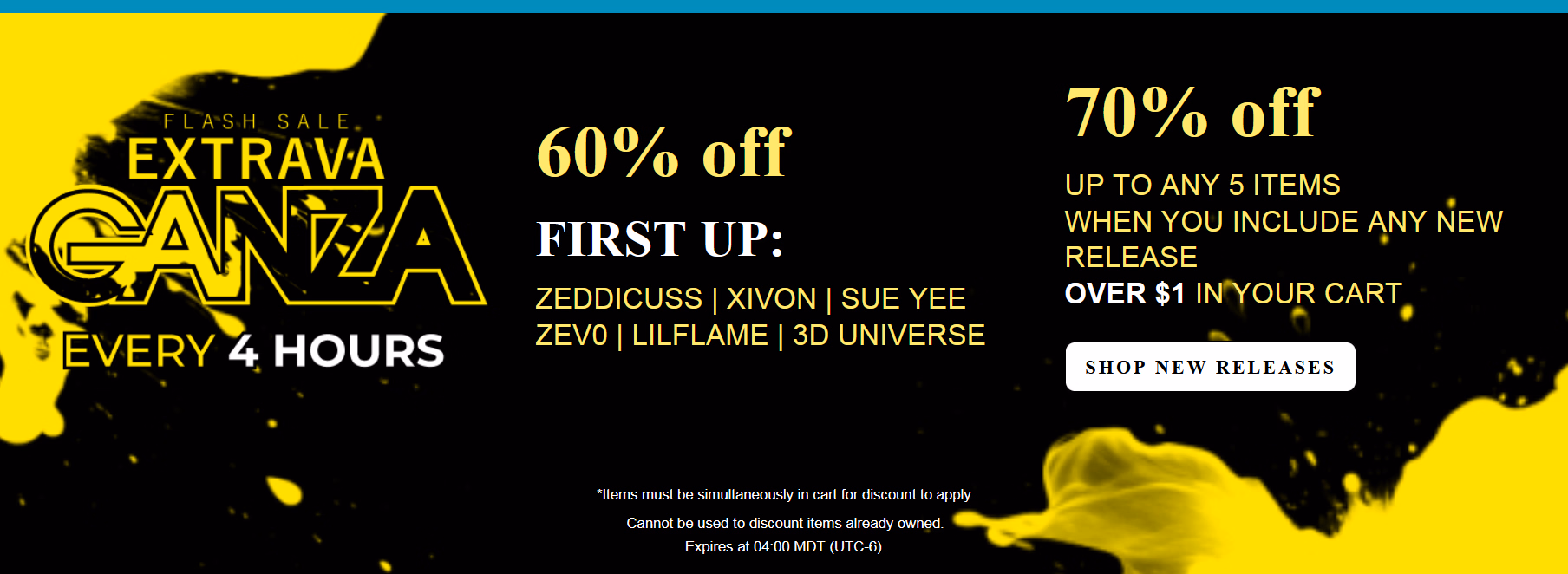Just noting that, over at Daz3D.com there are some pretty decent discount stacking in two of the sales currently going on (Serpentine & Wish, also Cinco). The buy-ins are still pretty steep, but I'm seeing a number of legacy items under $1 before tokens in the Serpentine sale.