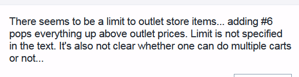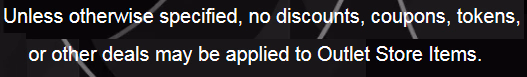Note that the extra 10%/20% off cart discount for outlet items is still in play, although I'm waiting for today's sale to be fixed. I'm kind of underwhelmed by the new items today, I was just testing the 'in cart pricing'.
