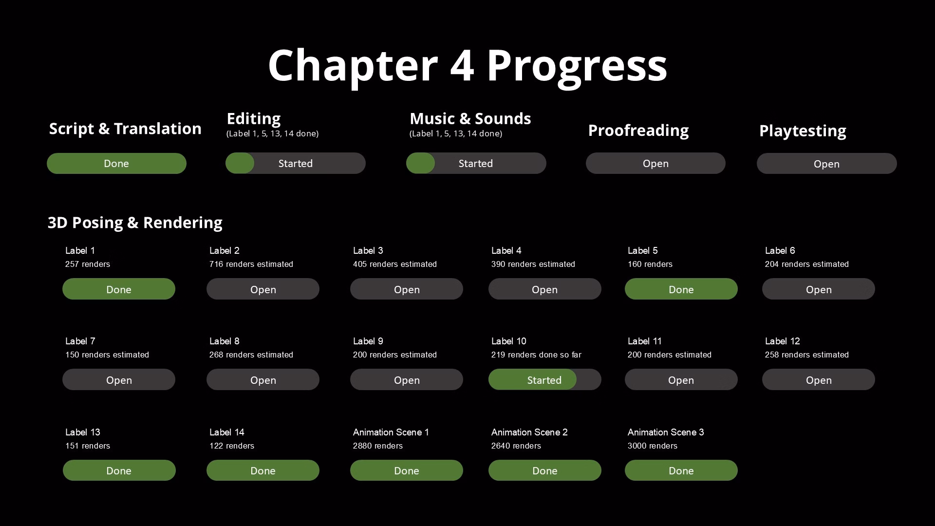 Since I have already completed almost all of the unpredictable work (animations), I will give a first cautious estimate. The only thing that could change this is the static rendering of the three animated scenes, as I do not script these in advance but pose them freely, as usual.