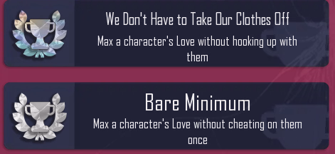 The game is surprisingly easy, but I mentioned that it can be hard to resist during a normal run. When it comes to the bare minimum, I believe that if you start dating one girl and then compliment another, it could be considered cheating. Especially if you asked for a polyamorous relationship, and she asks for time to think about it.Maxed out both Rogue and Laura's love stat without even hooking up with them and it came naturally , didn't even realize there was a achievement attached to it until that notification went off , the same goes for the bare minimum achievement