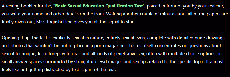- A scene for content where I have an NPC with variable gender/personality takes about 4-5 work days to write, as I'm writing about 3+ scenes in total (especially if it's sex related) with constant coding to compensate for it.