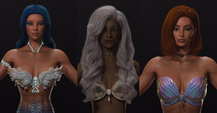Initially, we'd posed the mermaids with naked torsos, but this week we've been working on unique outfits for them. We're happy with how they've come out. We haven't shown off the Realm 4 ladies much yet, but we will start sharing more of them after we release the side paths.
