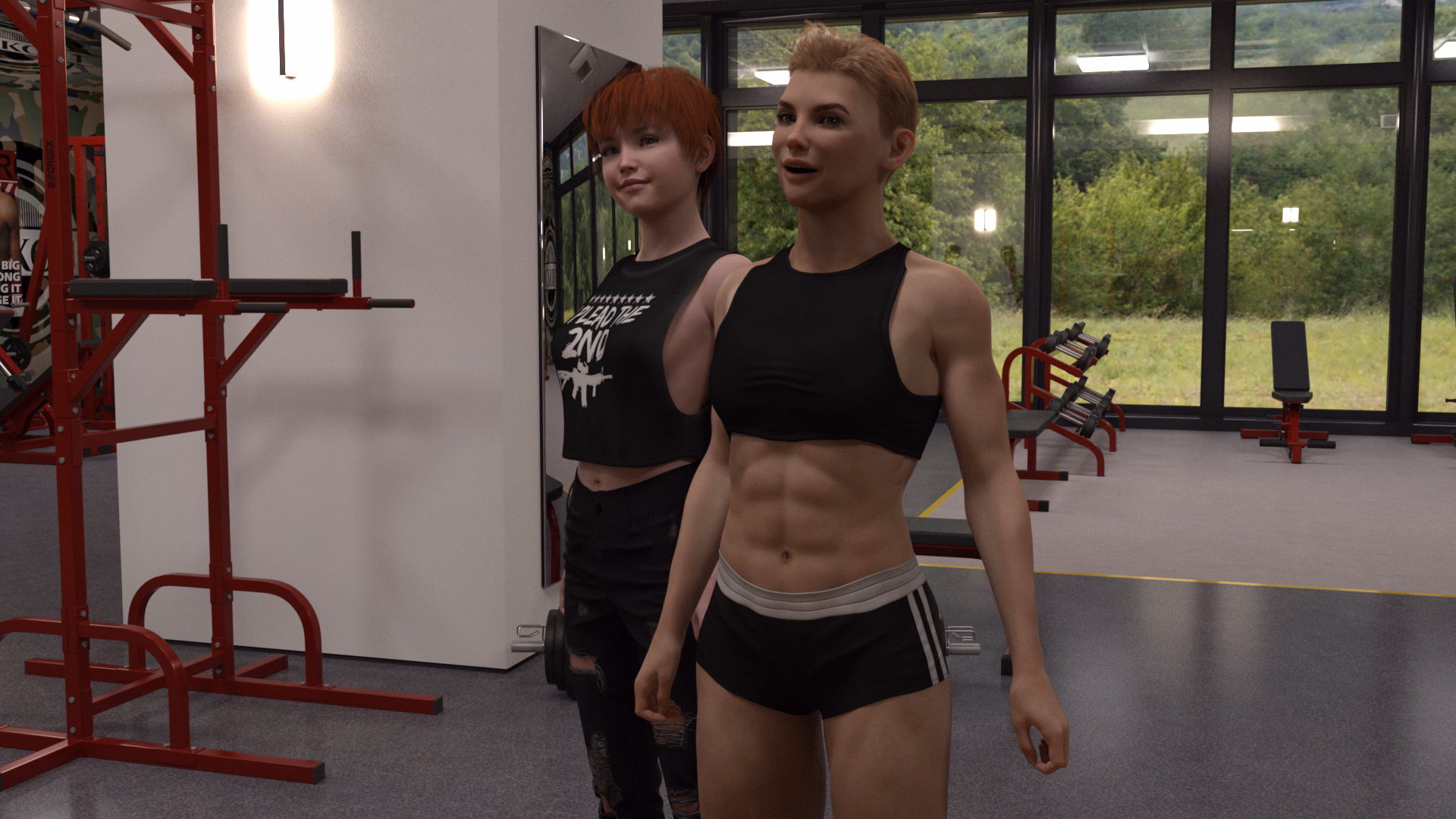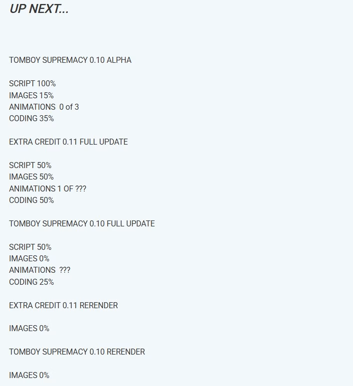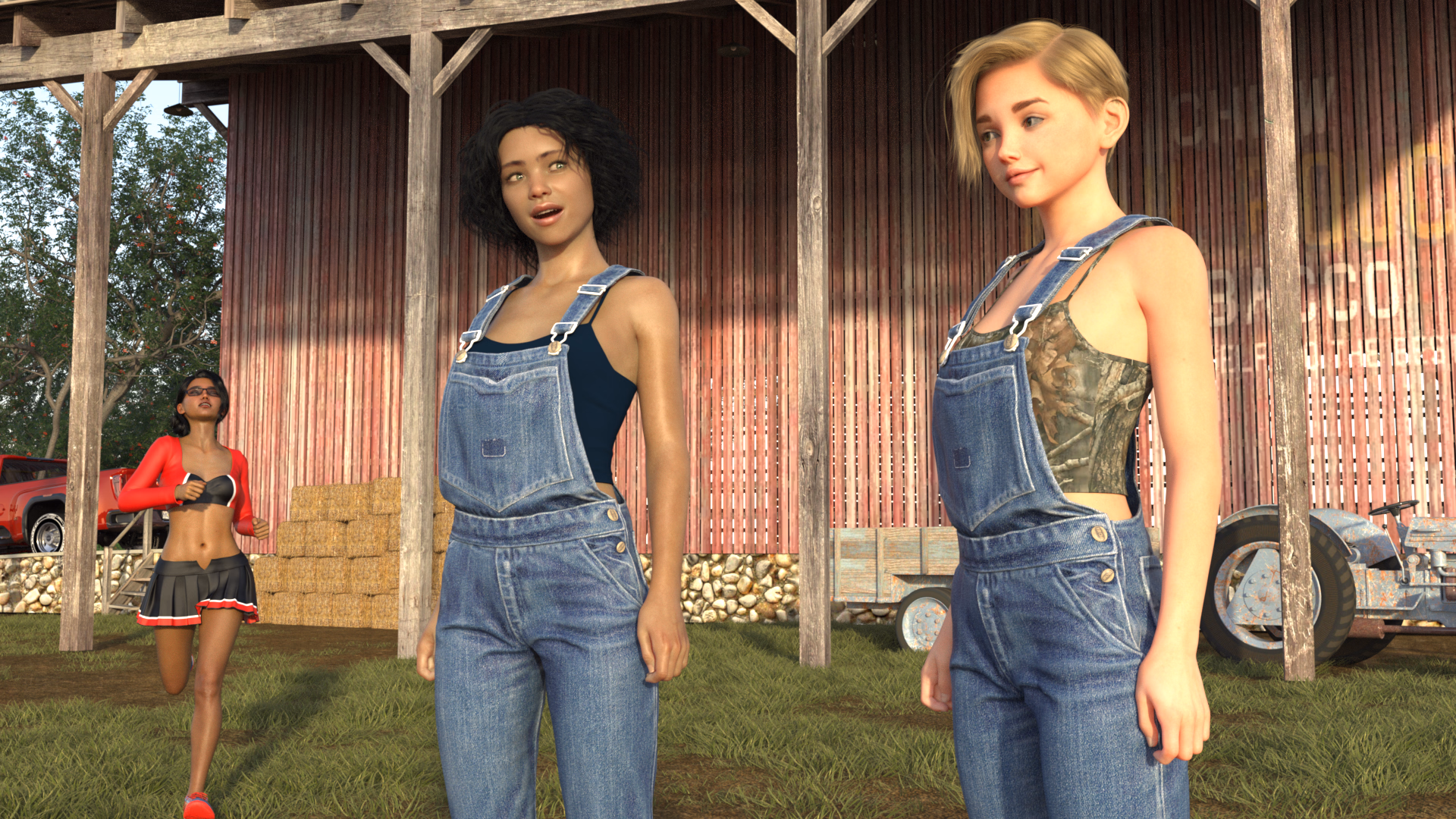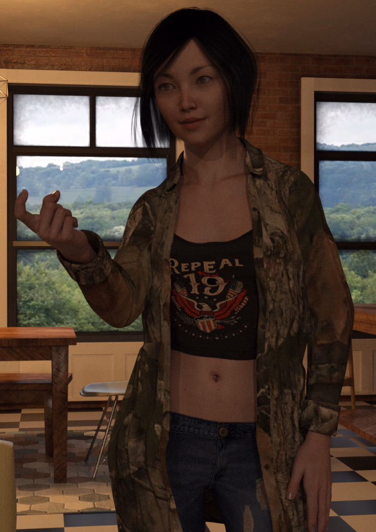The second is much better - and not just because of the eye candy. Looks much more realistic and a better perspective of the overall environment. I've seen that yard in reality - the first one, not so much.I've been going back and looking at earlier Tomboy Supremacy scenes in DAZ. This scene here is from about a year ago during the Branson trip. I realized that the scene which looked simple was extremely overcomplicated when I put it together. This was because I was just learning how to custom build environments and didn't really know what I was doing. I loaded this scene up and got rid of the ugly looking resource heavy grass and ground and replaced it with something that looks really good but is easy on my GPU. By doing that I was able to put more trees in the background behind the fence which makes it look more realistic. It didn't take too long to do. About 15 minutes. What I'm thinking about doing to both Tomboy and Extra Credit is go back and rerendering about half the games. Both the new Extra Credit and Tomboy updates leave off on something that in TV would be considered a Season Finale. As you know the Lucifers are moving to West Virginia and something happens in Tomboy that I don't want to spoil. So I'm thinking that after these two updates are released I'll go back and upgrading the graphics up until about a year ago. This'll probably be early next year. What do ya think?