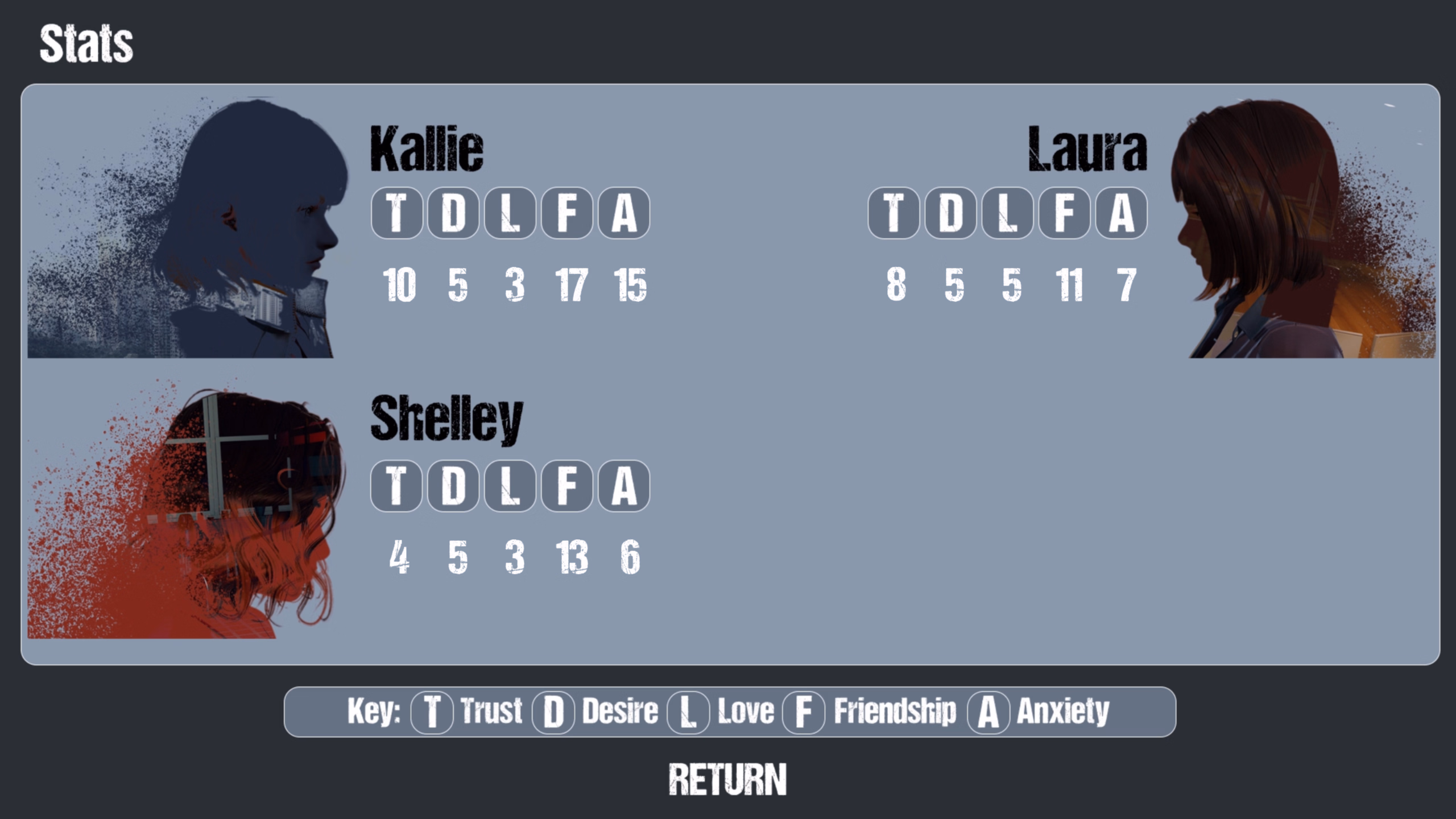 I can do that.Do you have a screenshot of your stats at the end of the chapter? Kinda curious what a full anxiety playthrough looks like.