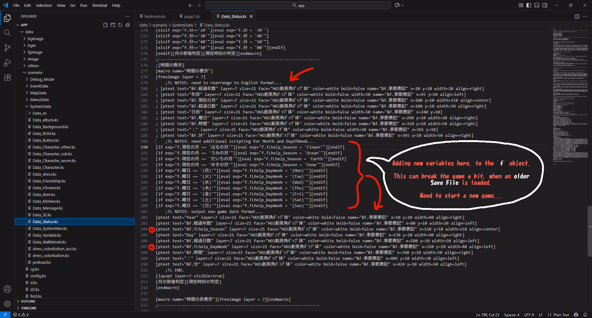 My Japanese is very basic, so I use Google Translate and WWWJDIC for hints and help on finding kanji, but I do the final texts manually. GIMP is good for text-images (I try to recreate the original look of UI elements as much as possible), and VS Code is great for making alterations, so game date is shown in English properly...