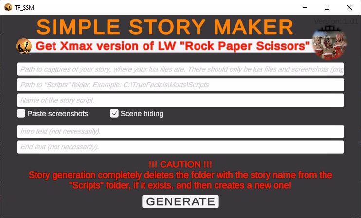 Also added a progress bar (will appear when clicking on "GENERATE"). Because of this, the program will work slower, but if the progress bar does not update (for a very long time), then some unexpected error has occurred (in such cases, let me know that there is a problem).