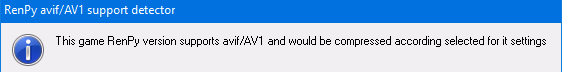 Did u saw message above before compression started as usual when auto avif/AV1 processing triggered? I'm almost sure that there in new version nothing changed regarding it but u can try older one if want. For me it works fine (didn't tested exactly game u mentioned by on similar RenPy version) and for 1 game judge about something not work I wouldn't so I advice to check ur settings. Also I need info from u if images and video compressed to avif/AV1 or not (webp/VP9 instead)?