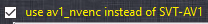 And to the above should ultrafast ffmpeg not turned of if you us av1_nvenc?