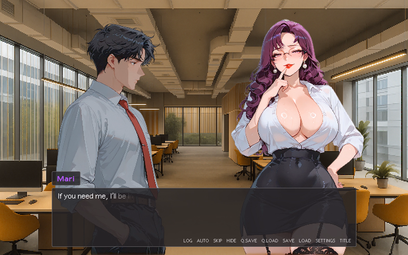Under the Desk is a spicy, satirical +18 visual novel where you play as an ordinary office IT guy who suddenly gets dragged into a crazy web of corporate intrigue, power struggles, secret affairs, and very… intimate office politics. Your goal? Survive (and maybe even thrive) in the ruthless fight for the director's chair of a big game development studio — while literally and figuratively spending a lot of time under the desk.