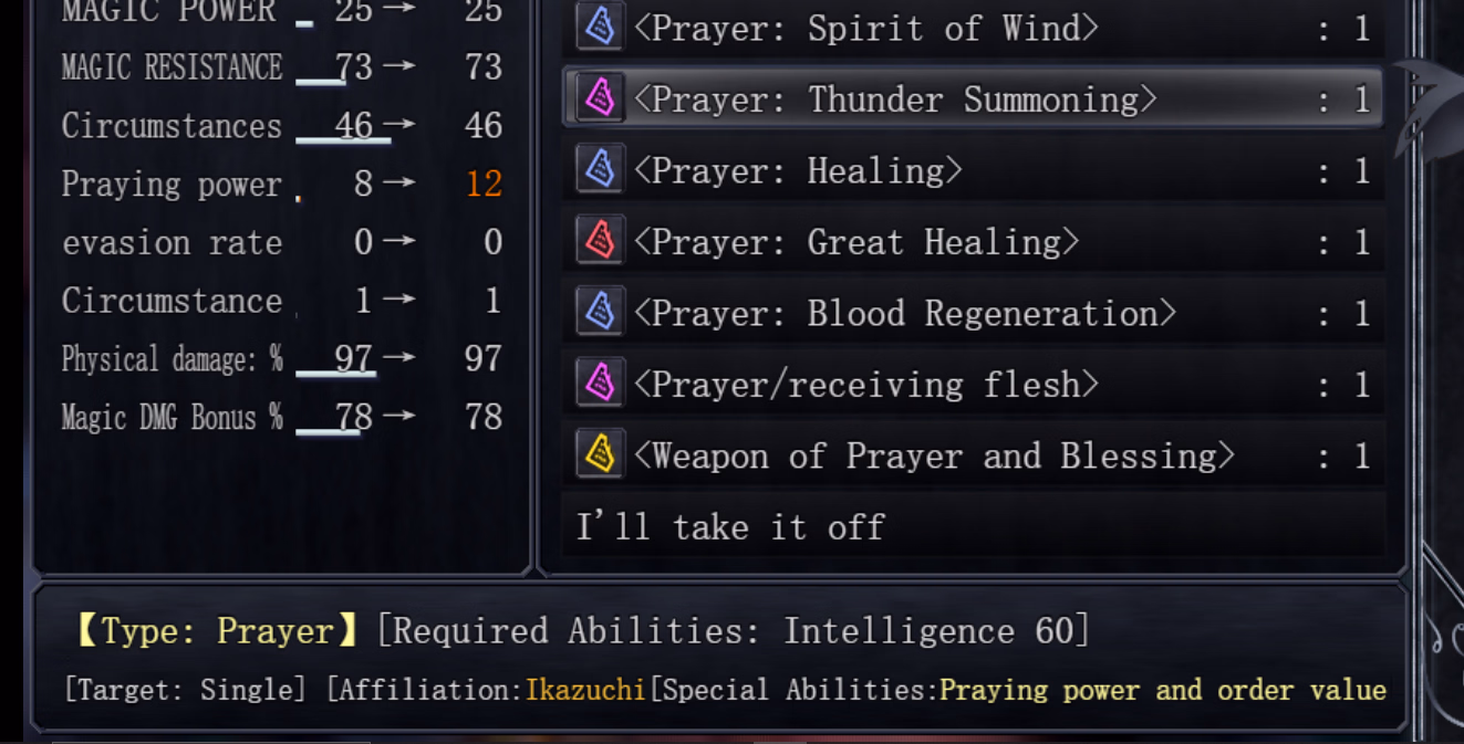 Is the thunder skill this one? I tried using it with 60 int but my dmg is really low at only 35 with prayer stat at 22 and max out order. I dont get how or what this spell scales on.If it scales with prayer then how do I increase it? Its not one of the stats you can increase with aether.