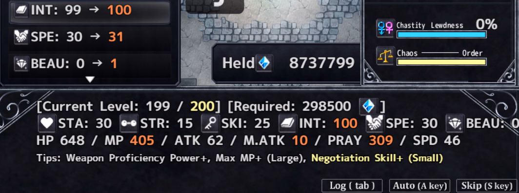 the debuff is more severe than just downing prayer power to ~260. That debuff would've cut it down by 50% so it should be way less, i think. That said, no. 260 is about right for 70 int in stats. By not investing 29 more points in int, that build lose 47 points in prayer power. S modifier on int is no joke.did you lose virginity and did you corrupt chastity values(50%Lewdness) i fueck up and my lewdness hit 50% so i lost pure maiden and got prayer debuff so now im thinking of replaying again because that sucked but well my real question is is it still manageable with the debuff cuz i lost about 35~45 prayer power when i lost the maiden trait and got debuff from lewdness anf virginity loss