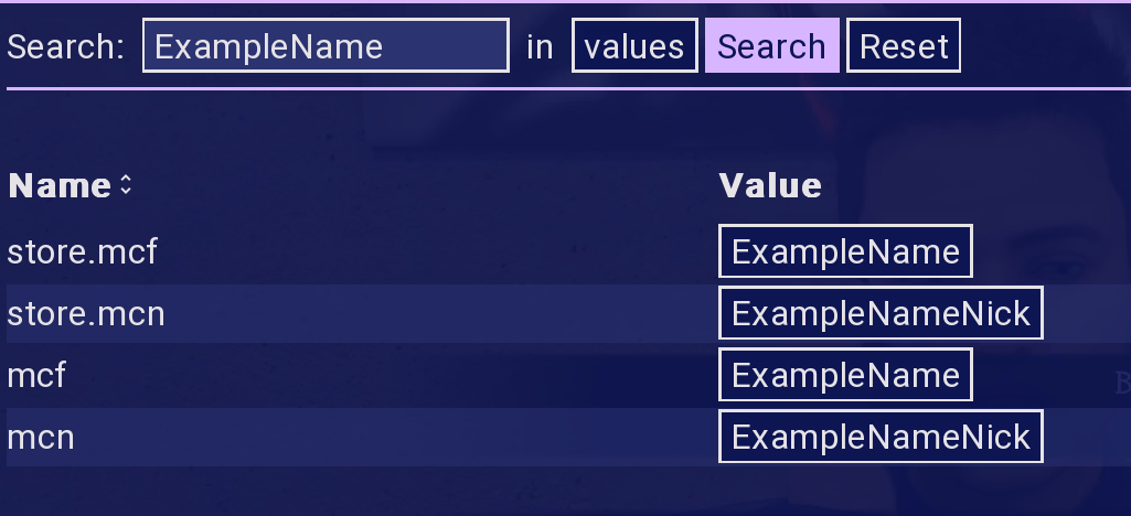 It does not work in Desert Stalker: persistent.player_name = Zaton by default, but it shows nothing by Values - Zaton. Changing to Zato, Values - Zato does not give results either.Search for the name you used as a value (in search click on Variable names > switch to Values) and see what comes up