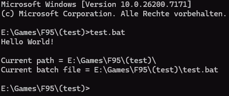 The output:Code:@echo off echo. echo Current path = %~dp0 echo Current batch file = %~f0 echo. echo %~dp0 | findstr ( > NUL if errorlevel 1 ( echo Path does not contain a "(" ) else ( echo Path does contain a "(" )