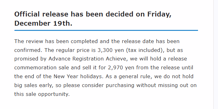 New article from the dev, release date confirmed for Dec. 19th! Sale price of 2,970 Yen (regular 3,300).