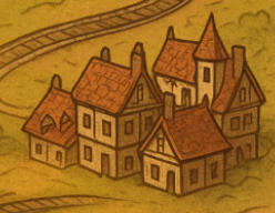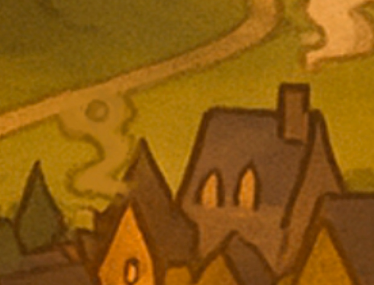 This one's easy: That's an overshot road eating into the house. I could see nit-picky criticism of it being poorly branched off, as they didn't do a great job of blending it into the original road and let more of the surrounding brighter green grass color seep into the road. But that looks more like an artifact of sloppy blending/changes that were made and never touched up properly. The smoke in there is very clearly coming from a chimney and going off to the sky, I see no reason to assume a house with no depicted chimney is also emitting smoke when a road into town makes more logical sense. Could it have been drawn better? Sure. But how much time do you want an artist to spend on small details so you can feel 100% confident it's not AI when AI would have things like:As well, There parts of the map that cannot decide whether they want to be part of the road (which is connected to the above) or whether they want to be smoke from one of the houses.