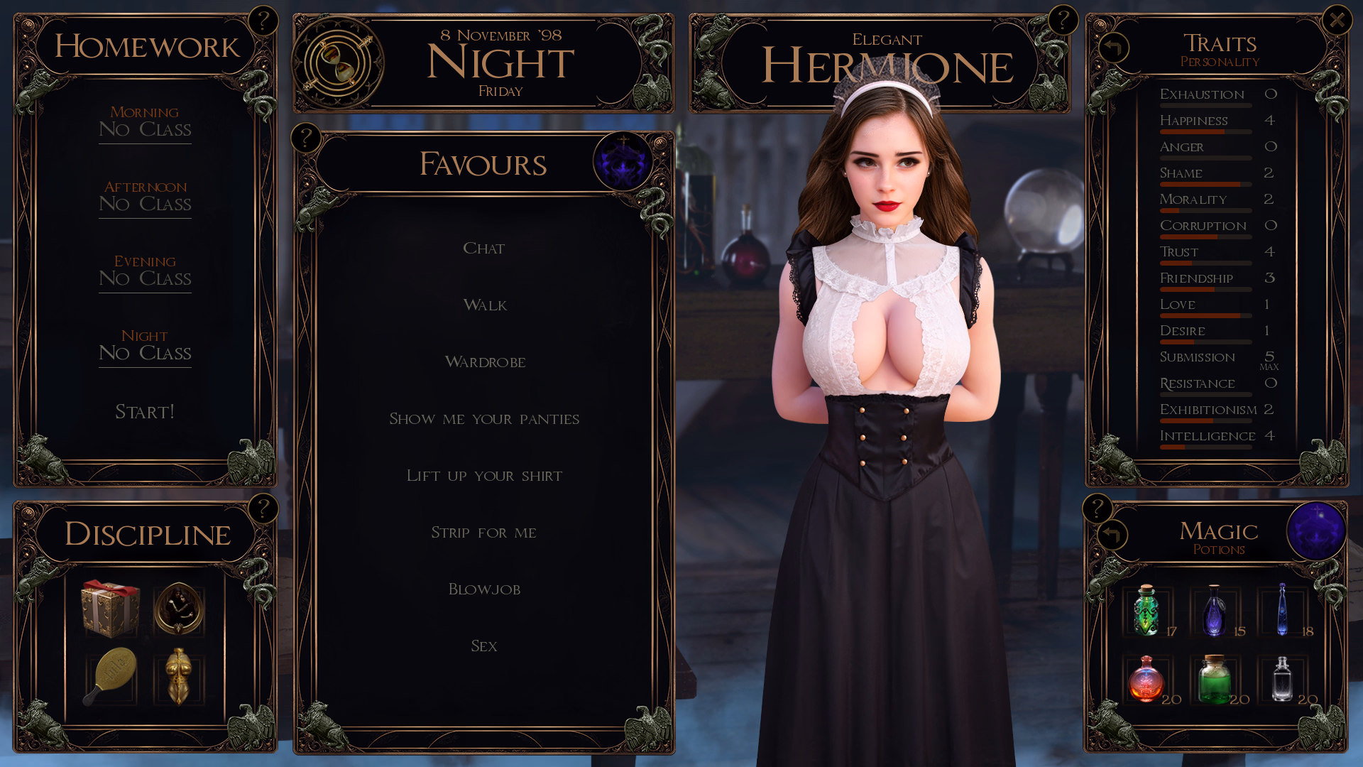 I feel that I should mention - WH isn't a simple 'AI CG'. I use a lot of 3D, make quite a lot of those models myself, 2D painting and AI are on top of that. I'm pretty sure it's impossible to achieve this look using AI only.In which regard? There are a few pretty decent Hermione games (pretty much Witch Trainer Silver, but Innocent Witches used to be good and there's a DAZ 3DCG one I think), I'm actually not familiar with any dress-up focused trainer games like this, and there are no other games that use AICG like this one does.