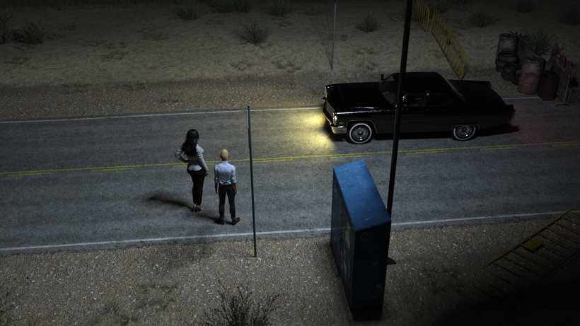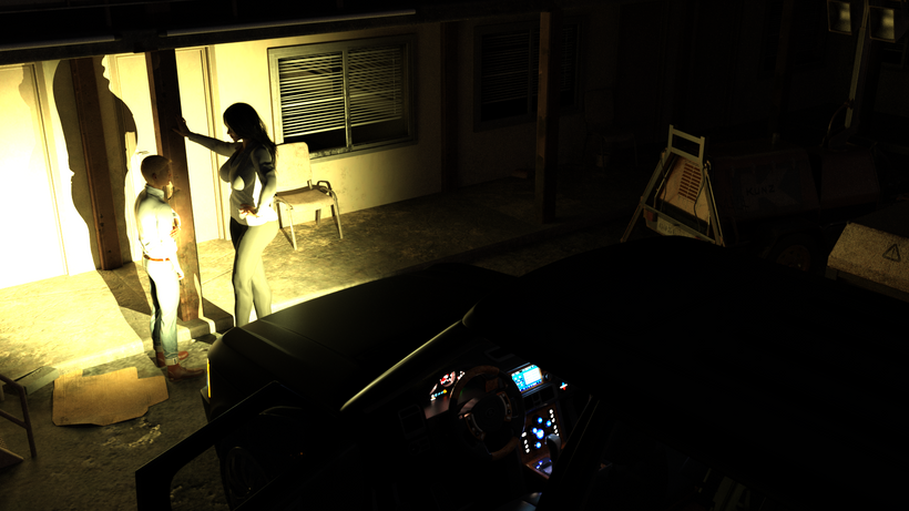 Starting with the renders. The conversation I'm rendering takes place in the middle of the night on an abandoned, blocked road. Two other characters will be introduced here, playing antagonistic roles. Both were previously shown in the game as a "coincidence of fate" that connects the characters' paths ahead of time. This conversation was originally going to take place in the final scenario, but I decided to add another one prior to the final scenario because it makes more sense for the story I want to tell. This scenario is simply a road with some fences along it indicating a blocked road. There, a discreet meeting takes place between Mrs. Bellmere, accompanied by the MC, and Miko Gabor. This is an important madam in the city who was involved in the MC's past and is a rival of Mrs. Bellmere's group.