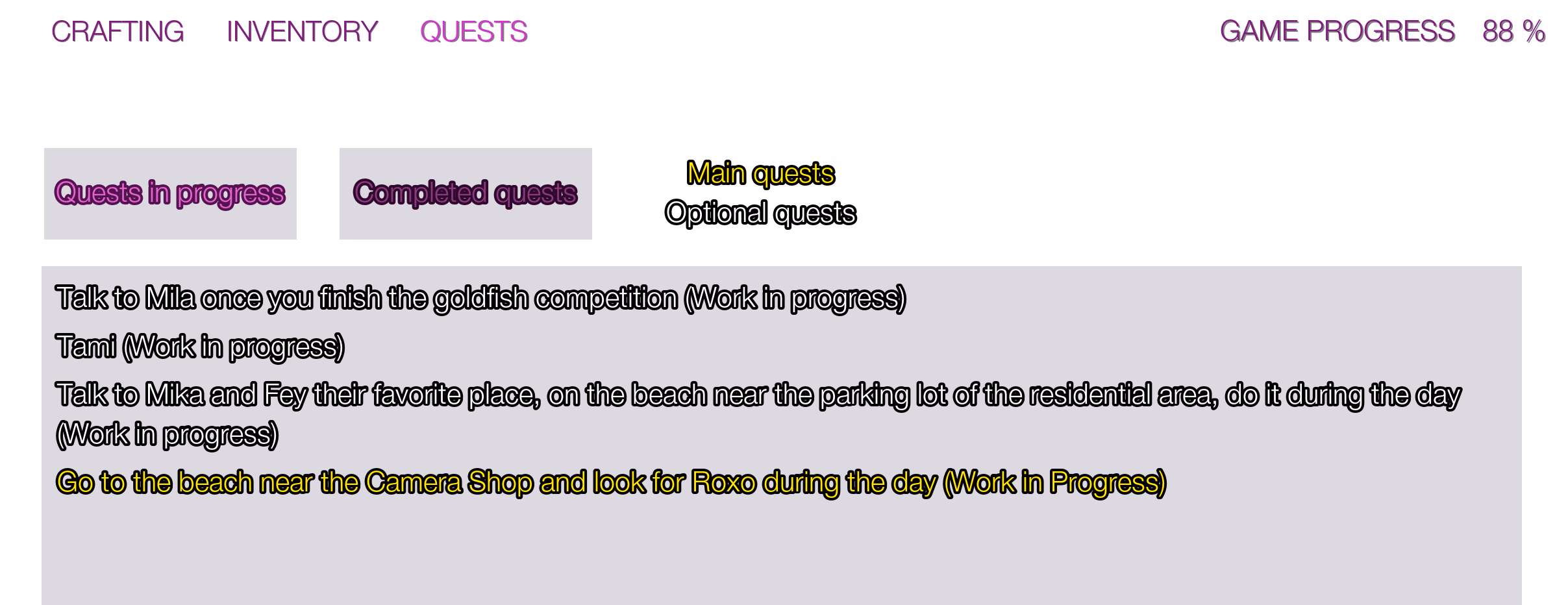 quests say work in progress, and completion is at 96%